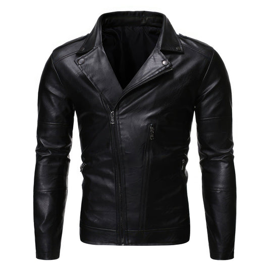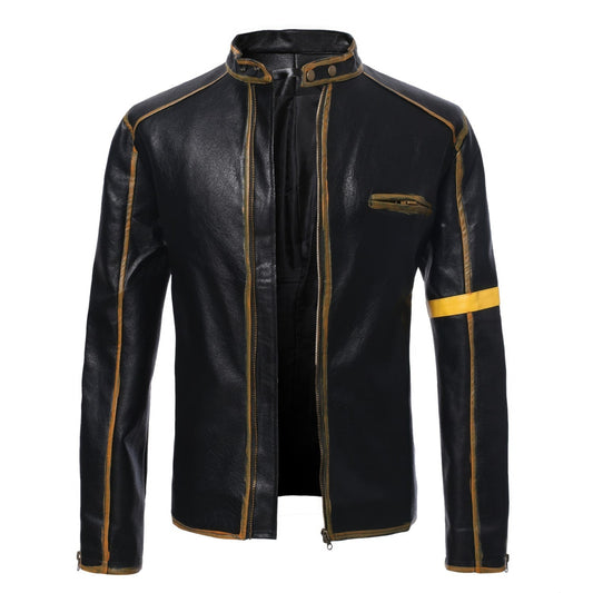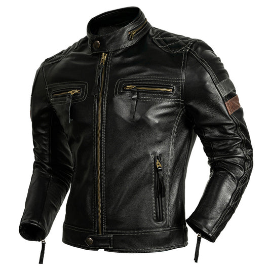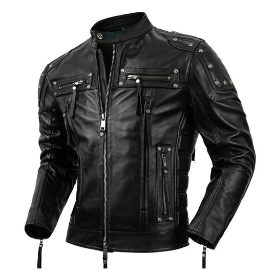 Men’s Black Biker Genuine Cowhide Stand Collar Multi-Zippers Moto Rider Classic Leather Jacket