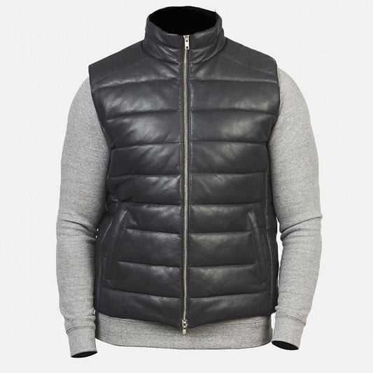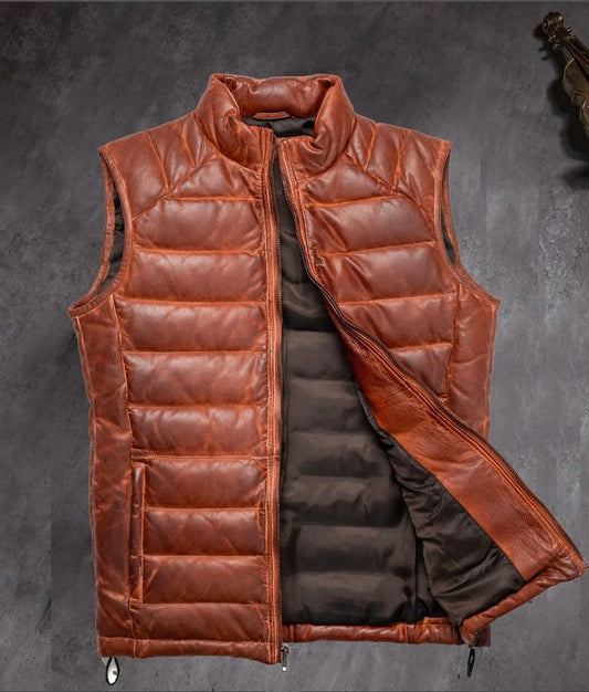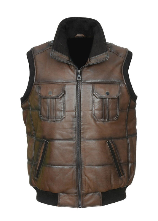 Men's Brown Leather Puffer Vest: Sleeveless Jacket, Perfect for Casual Wear, Genuine Leather