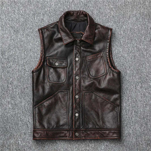 Men's Genuine Leather Motorcycle Biker Vest with Multiple Pockets - Sleeveless Cargo Jacket