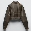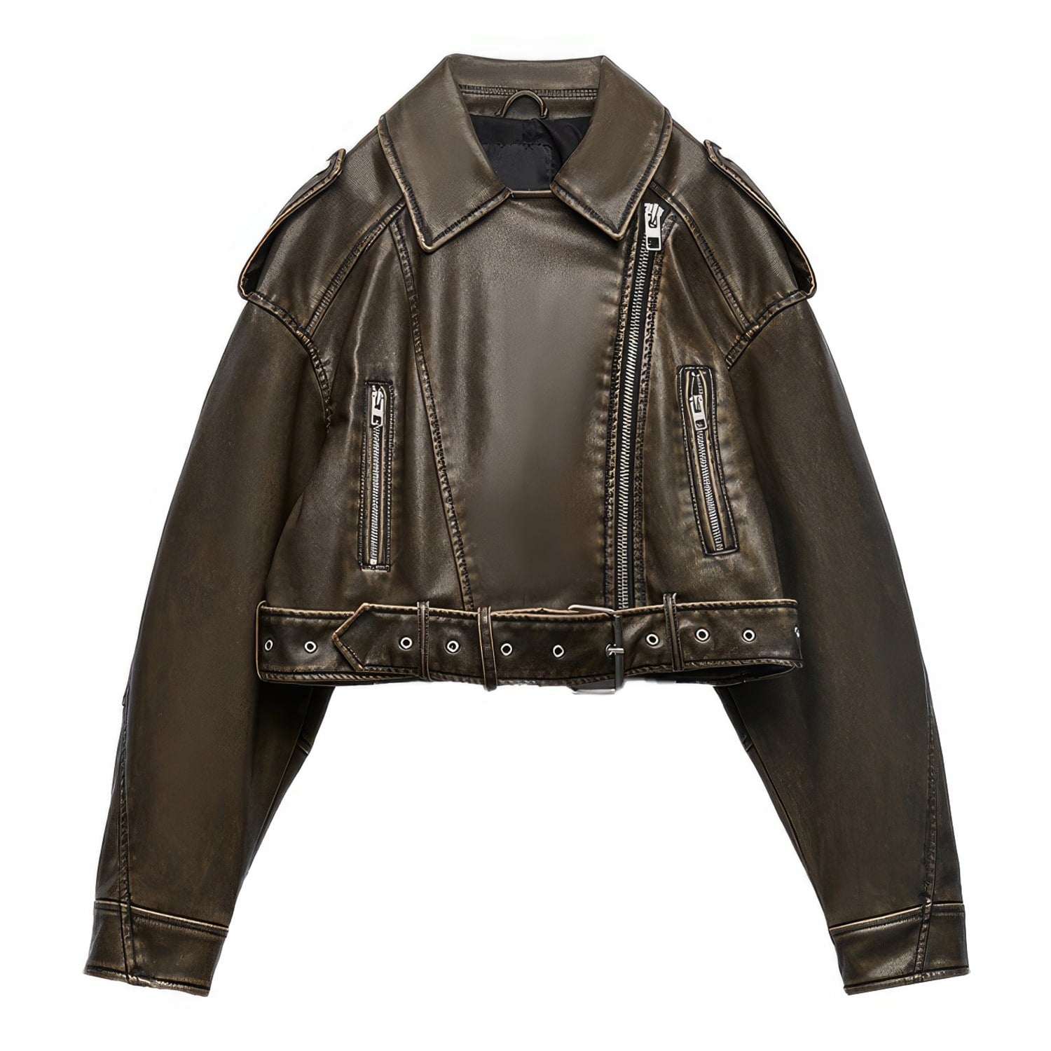 Women’s Biker Vintage Brown Genuine Sheepskin Sporty Casual Moto Biker Lapel Collar Café Racer Streetwear Loose Asymmetric Leather Jacket