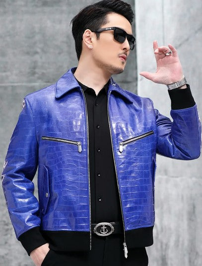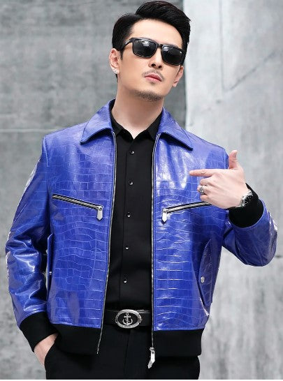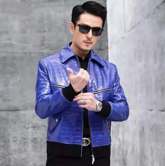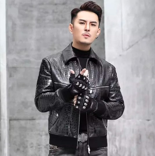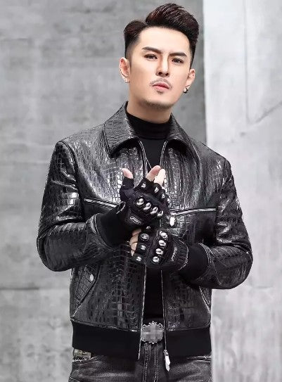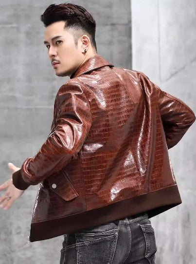 Crocodile Pattern Men's Slim Fit Motorcycle Biker Jacket in Genuine Sheepskin Leather