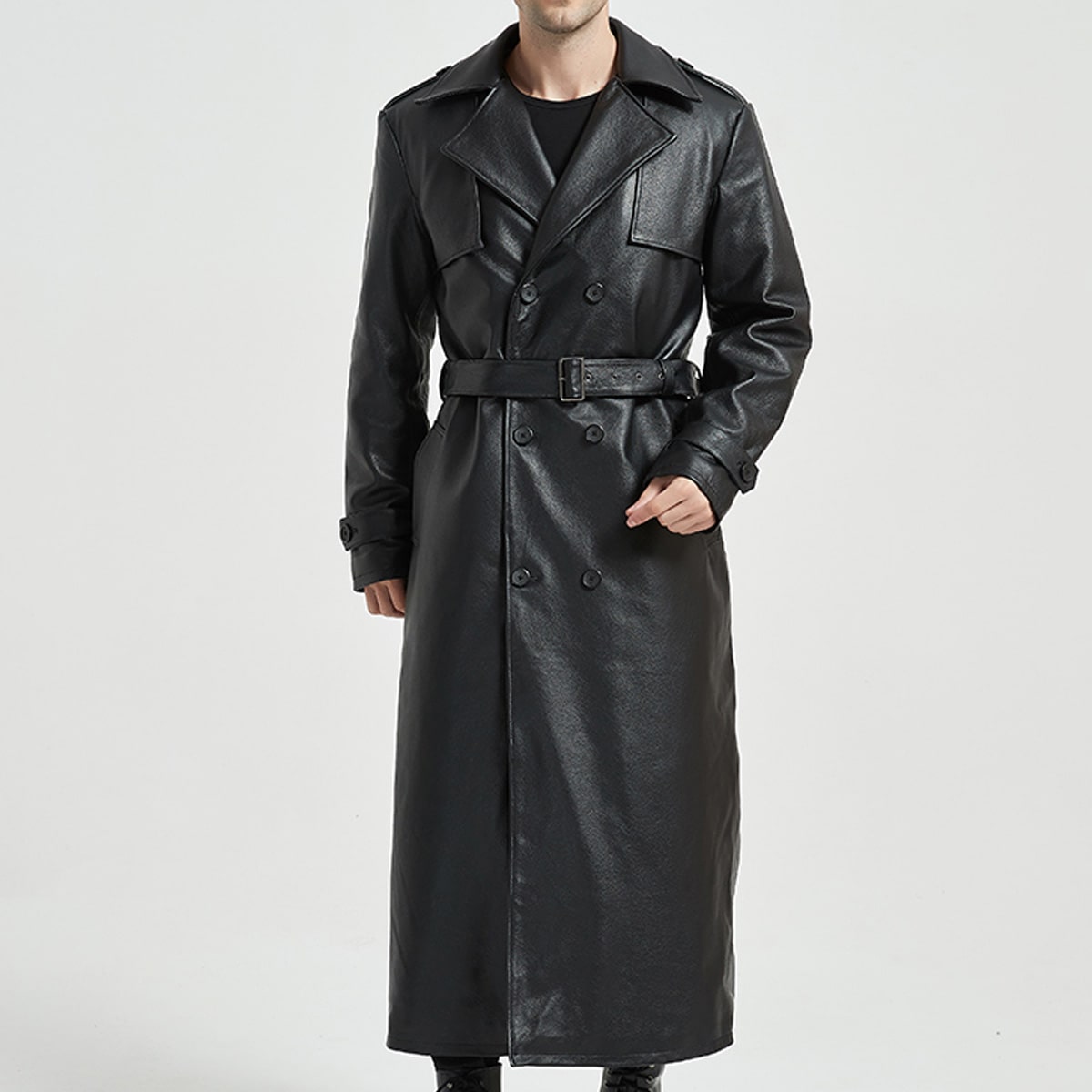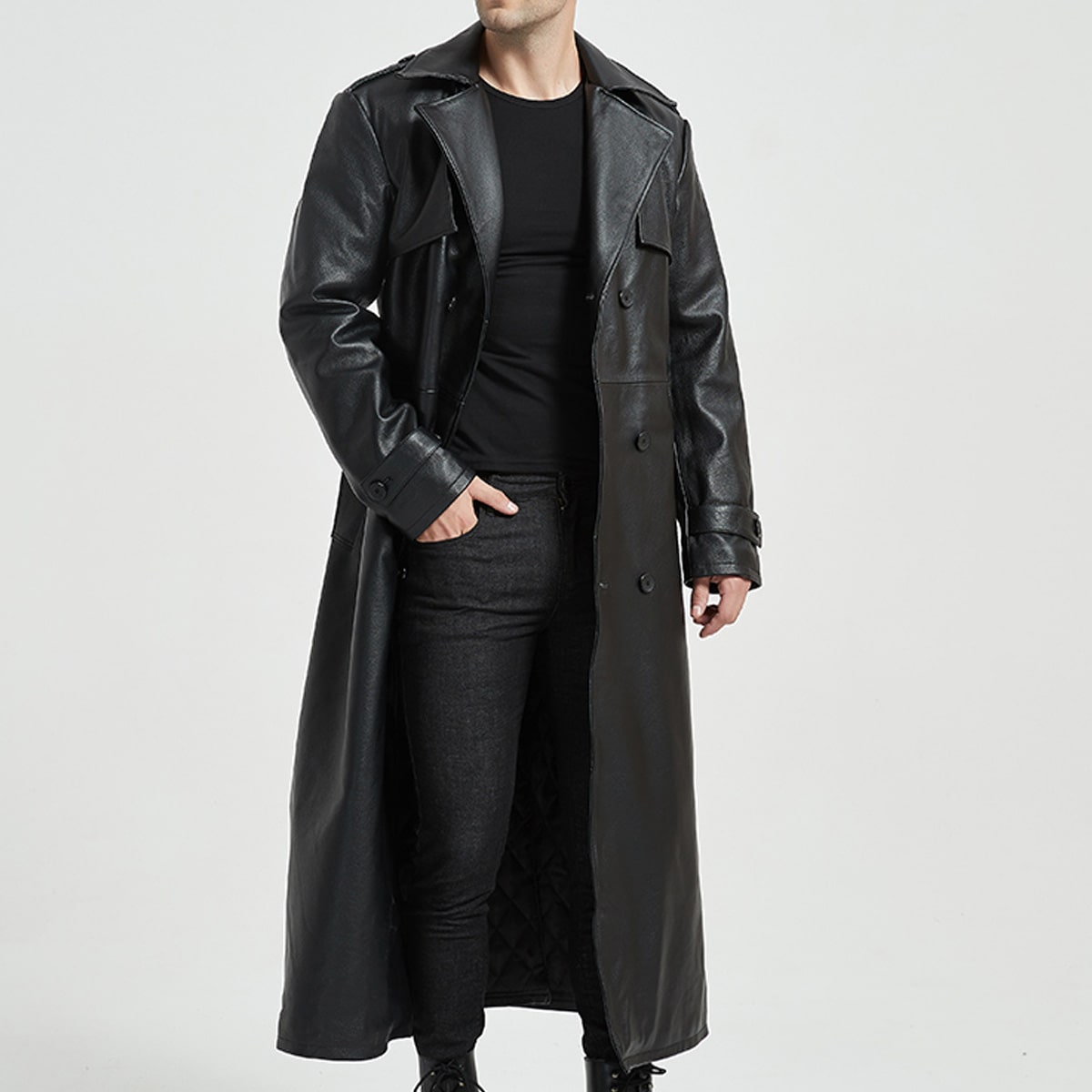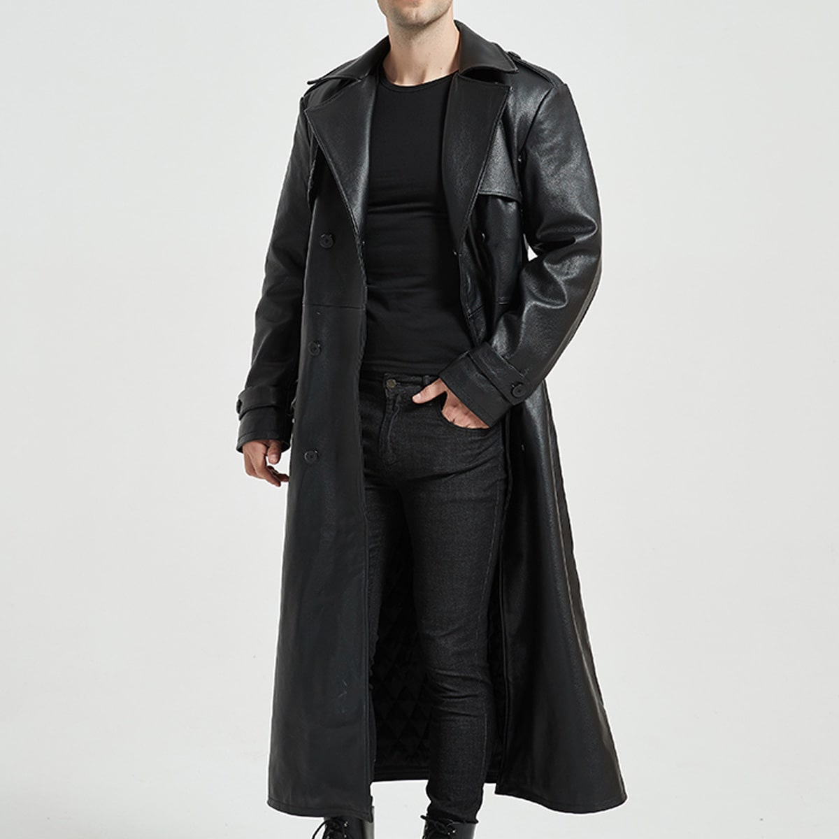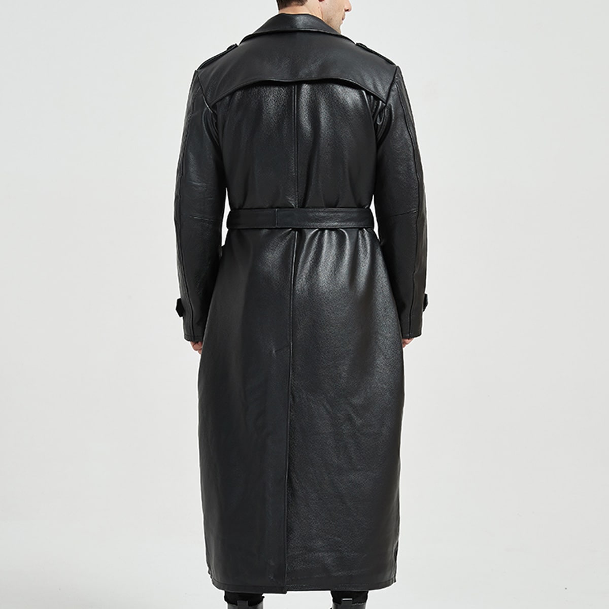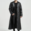 Black Genuine Sheepskin Lapel Collar Slim Fit Matrix Quilted Long Leather Trench Coat