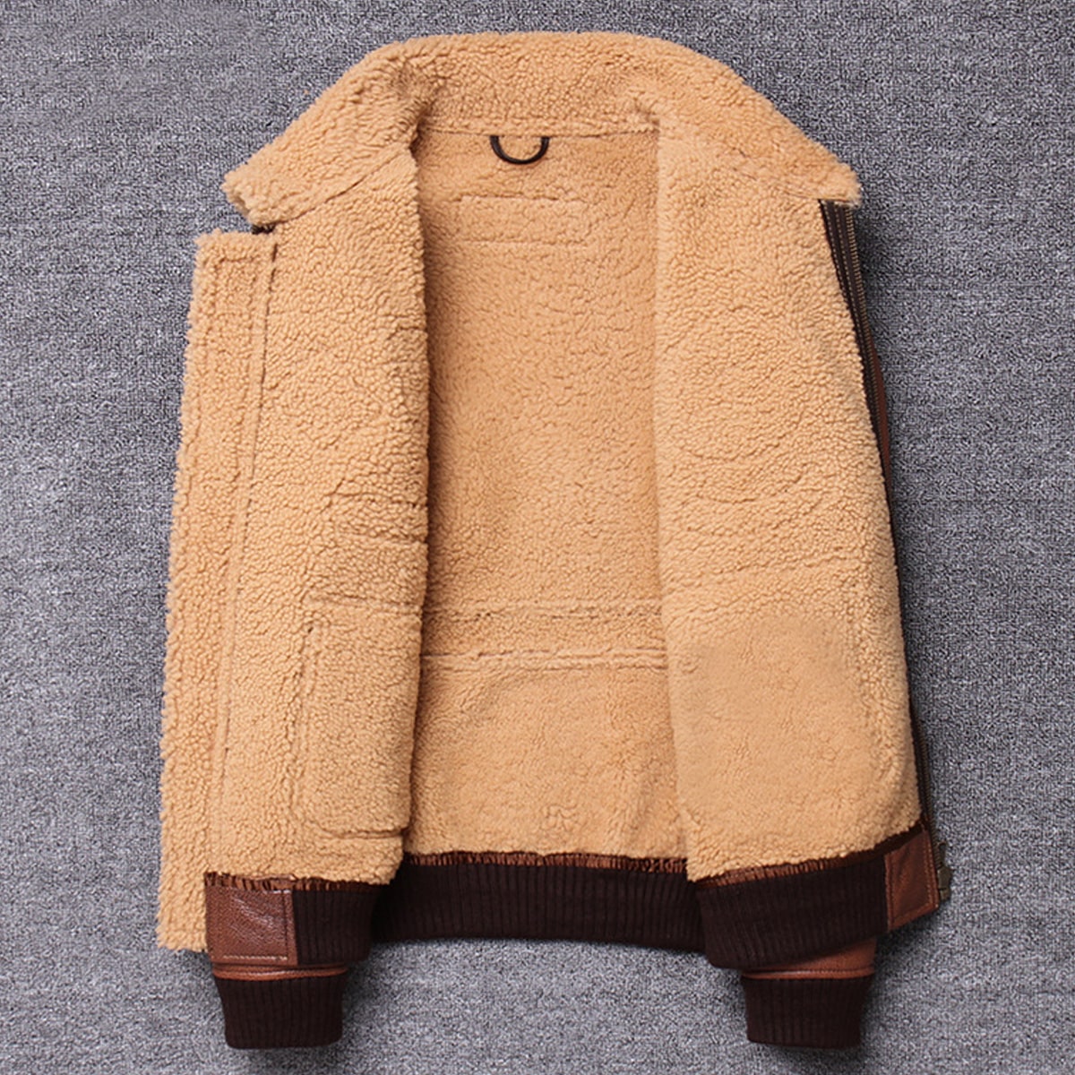 Men’s A2 Aviator Brown Genuine Sheepskin Embroidery Patch Faux Fur Air Force Pilot Military Bomber Leather Jacket