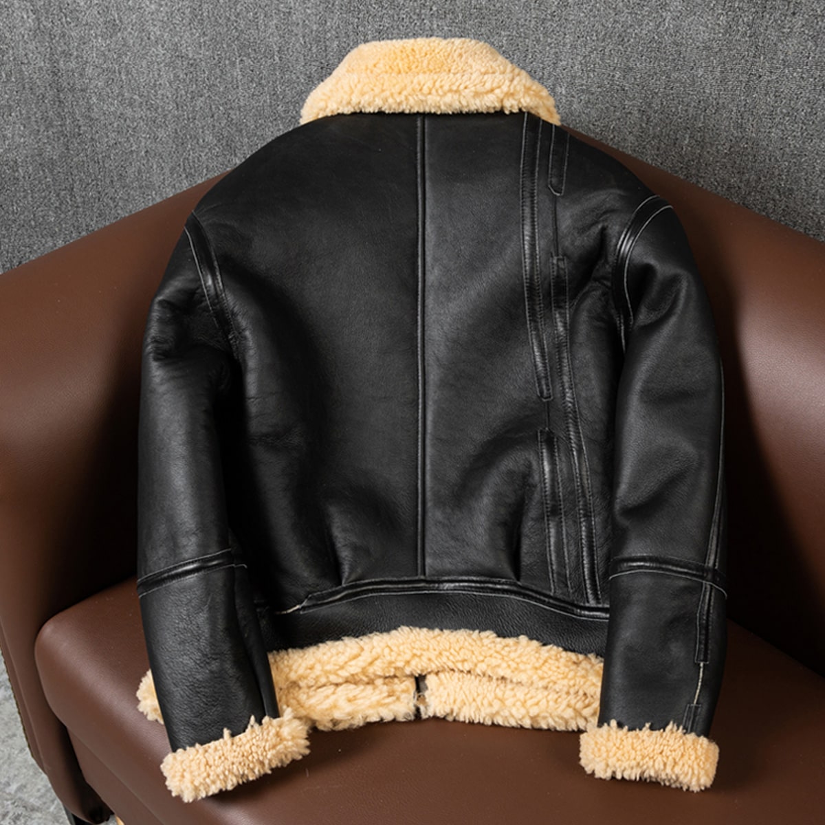 Men’s Black B3 Bomber Aviator Genuine Sheepskin Sherpa Shearling Faux Fur Turn-Down Collar Winter Warm Pilot Uniform Leather Jacket
