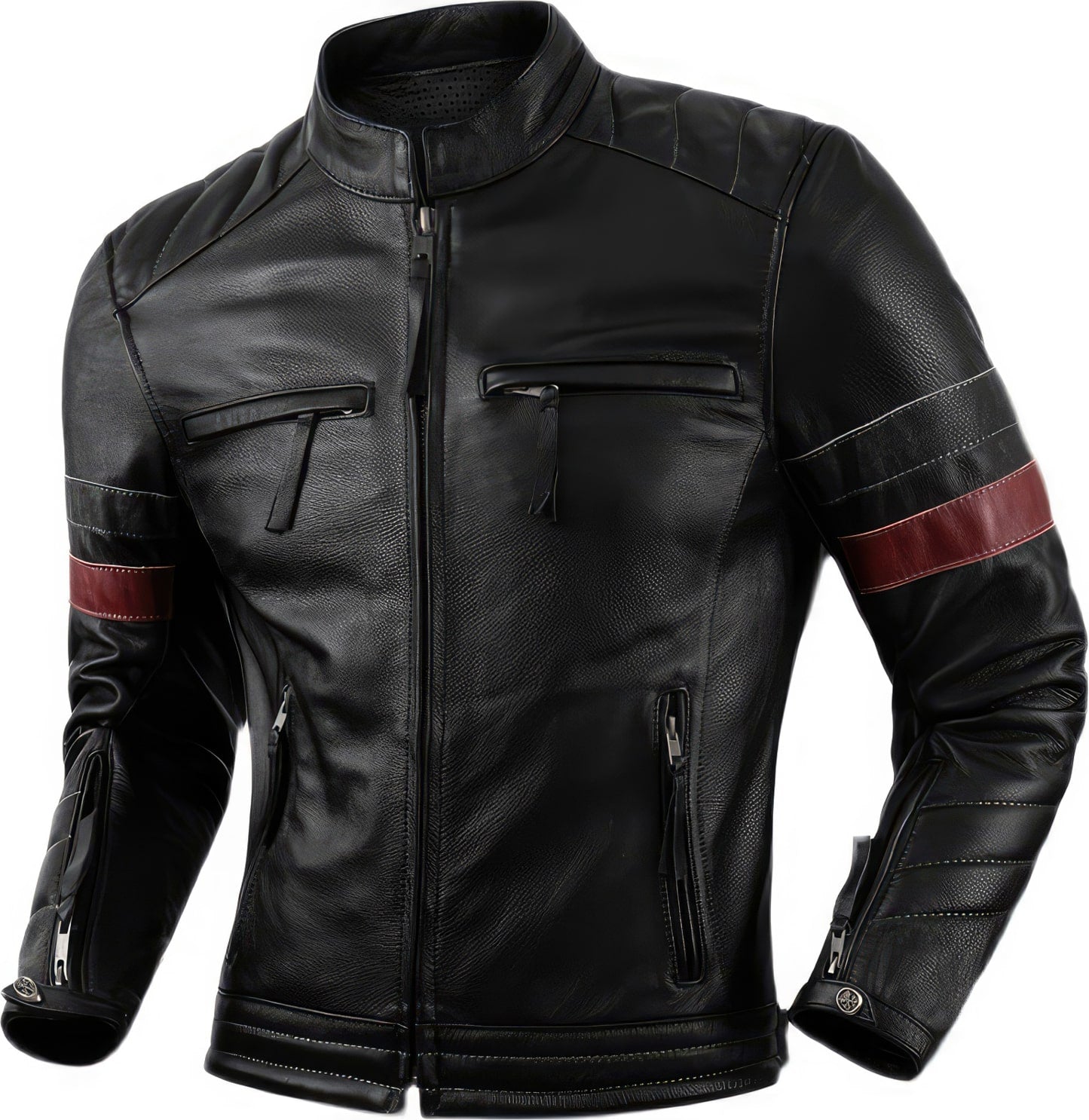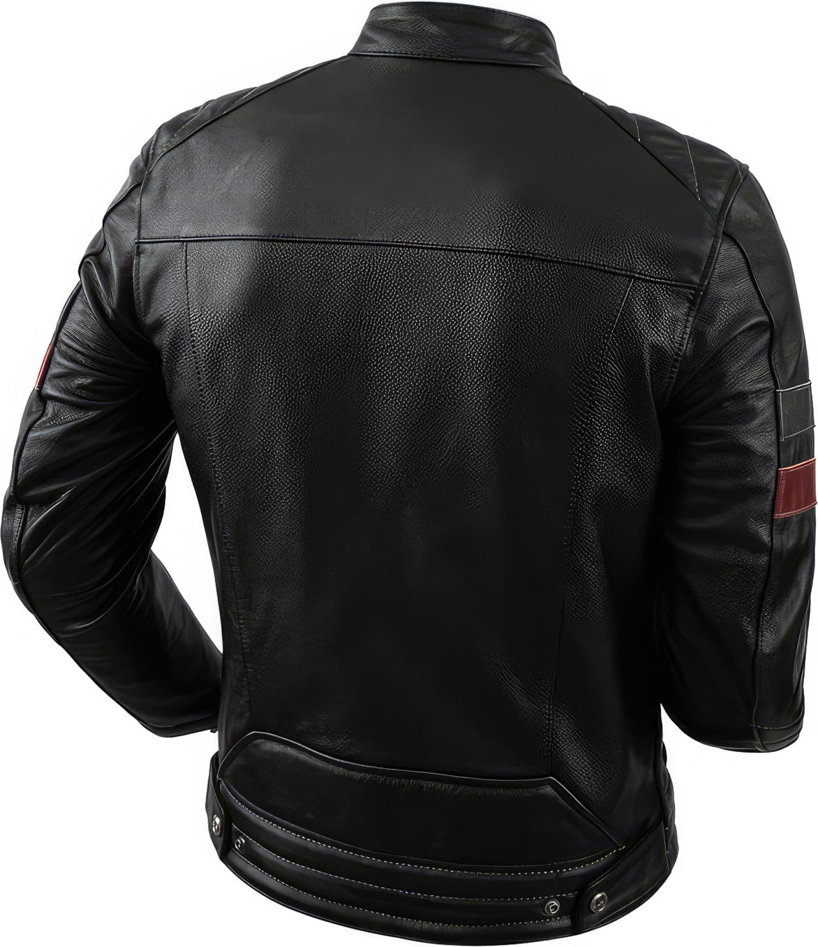 Men’s Black Biker Genuine Cowhide Stand Collar Motorcycle Retro Red Strip Racer Smooth Lightweight Leather Jacket