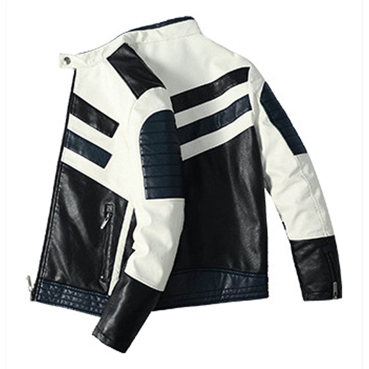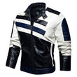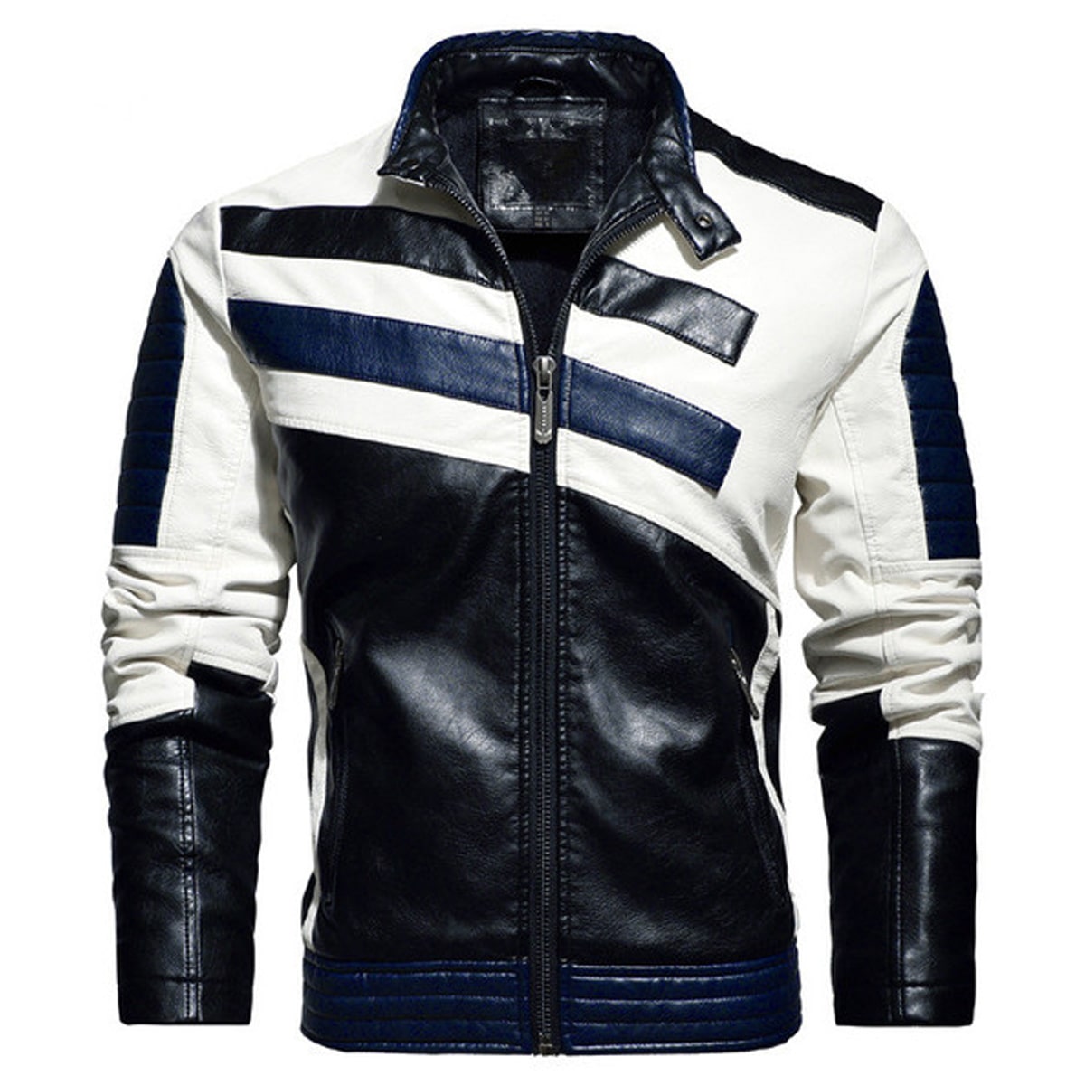 Men’s Black Biker PU Café Racer Stand Collar Striped Black Blue White Toned Outfit Moto Rider Zip-Up Casual Classic Streetwear Slim Fit Faux Leather Jacket