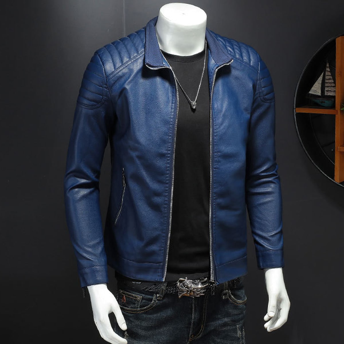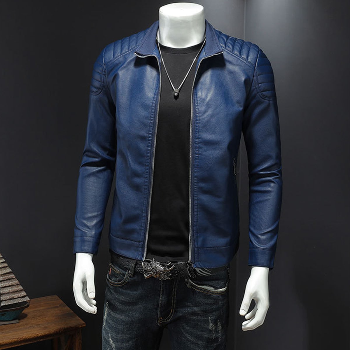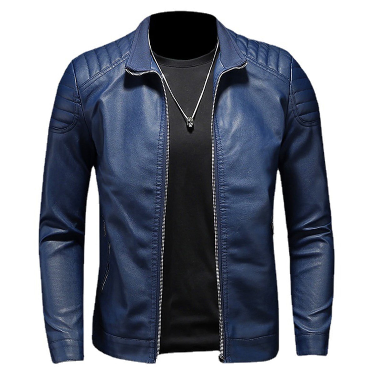Men’s Blue Biker PU Stand Collar Korean Style Quilted Shoulders Motorcycle Rider Smooth Fashionable Casual Classic Faux Leather Jacket