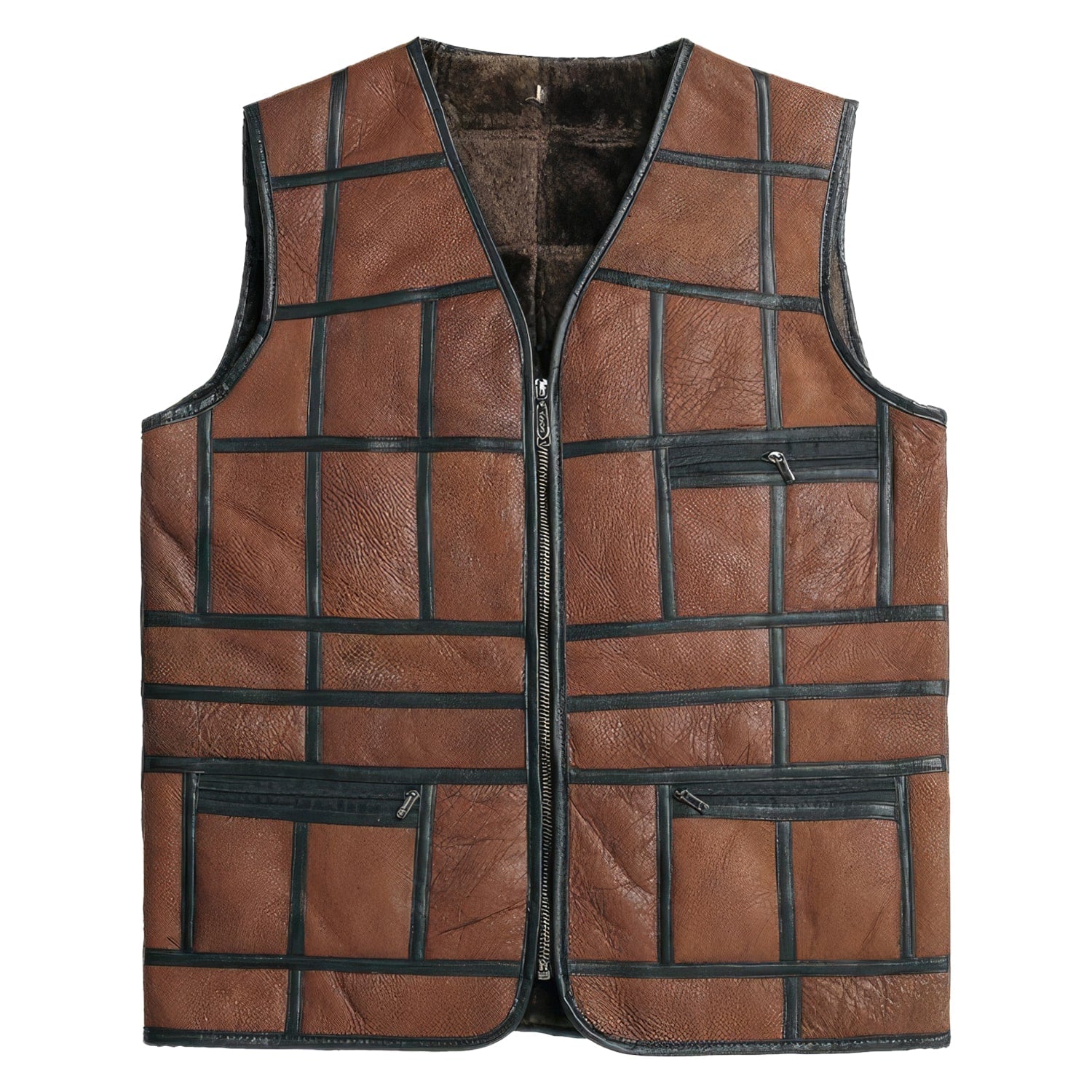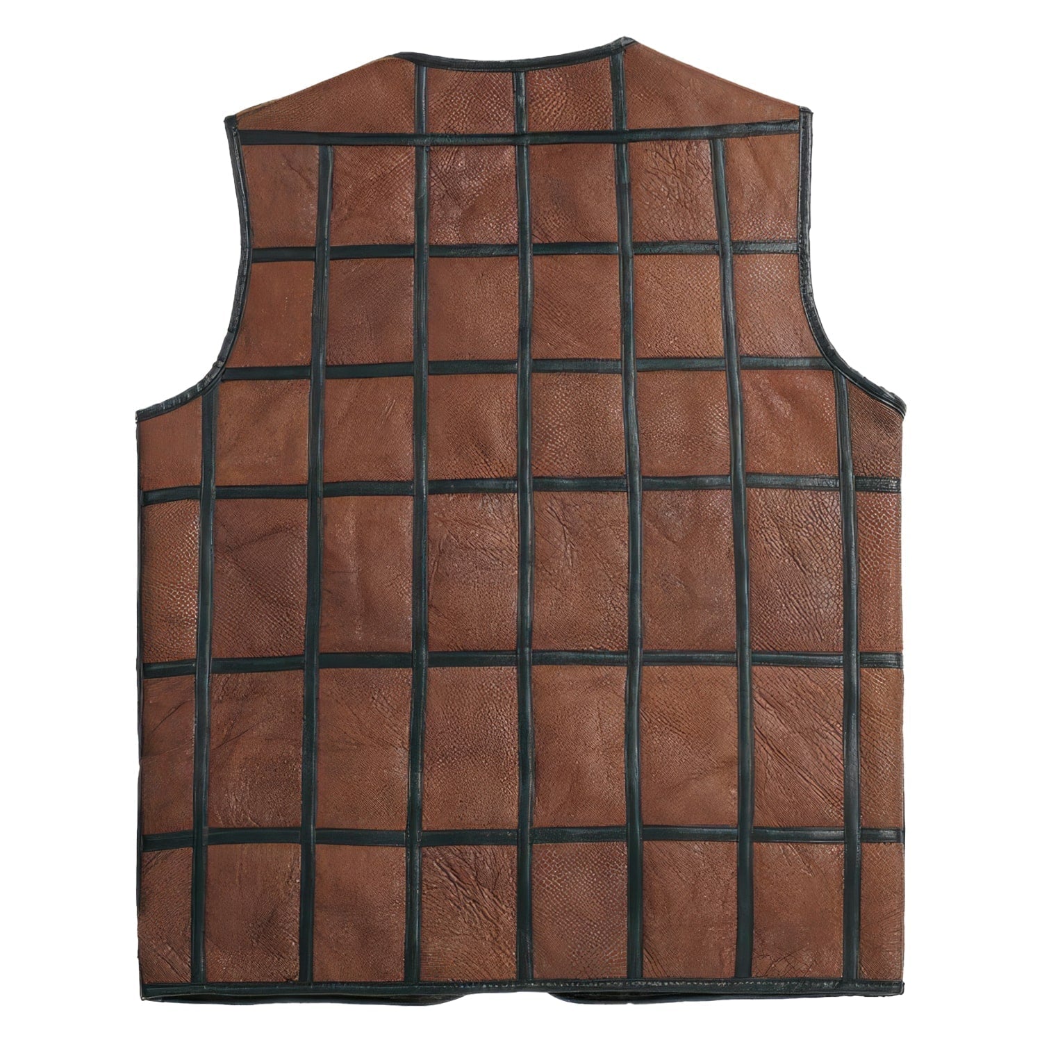 Men’s Brown Genuine Sheepskin Leather Black Stripped Design Vest Classic Fashion Casual Distressed V-Neck Leather Waistcoat