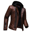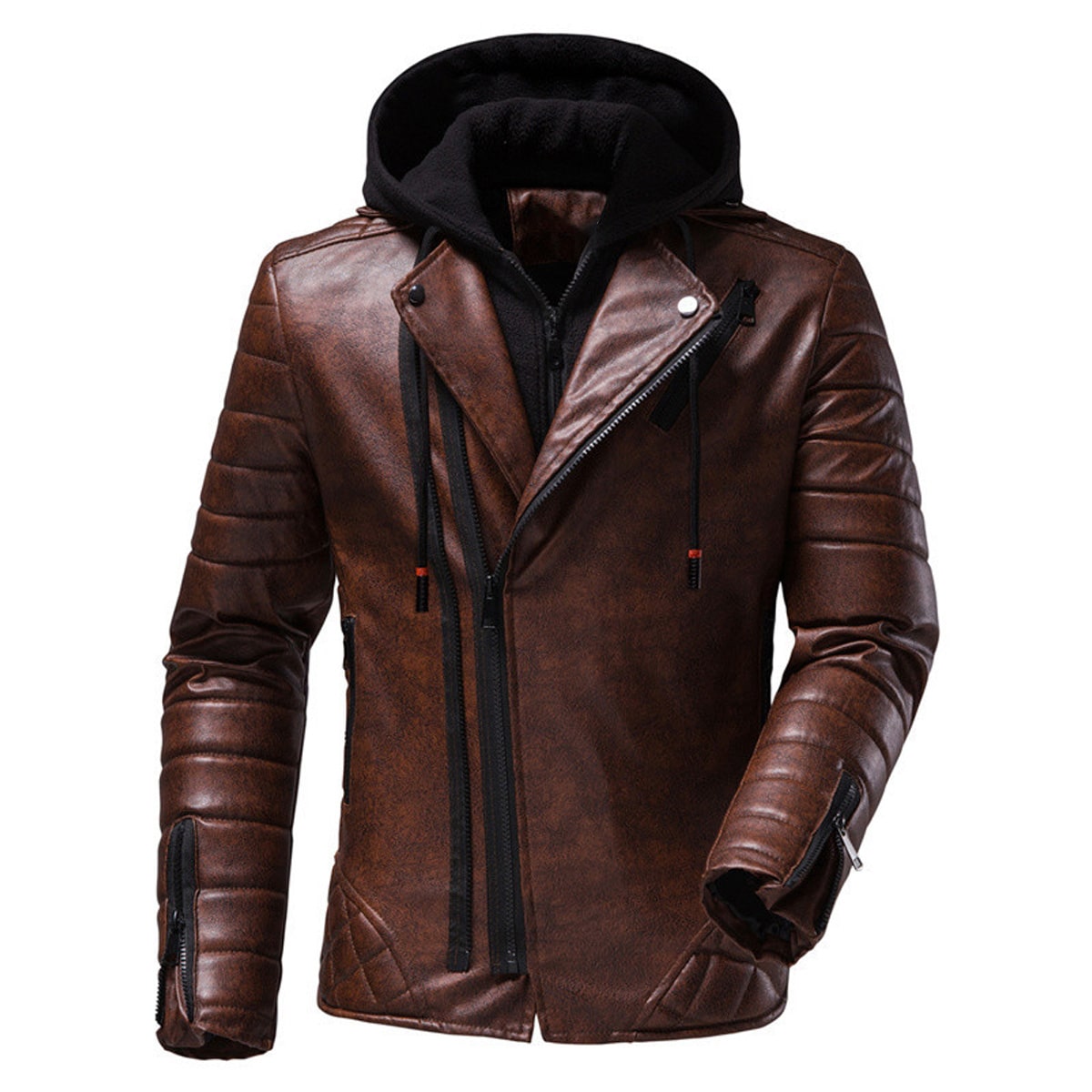 Men’s Vintage Distressed Brown Biker Genuine Sheepskin Lapel Collar Hooded Motorcycle Rider Crossover Retro Quilted Asymmetric Leather Jacket