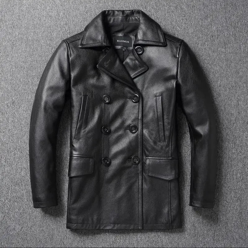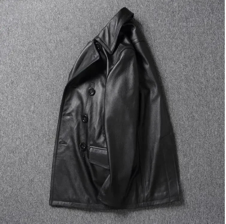 Men's Black Cowhide Leather Trench Coat - Genuine Leather Long Windcoat