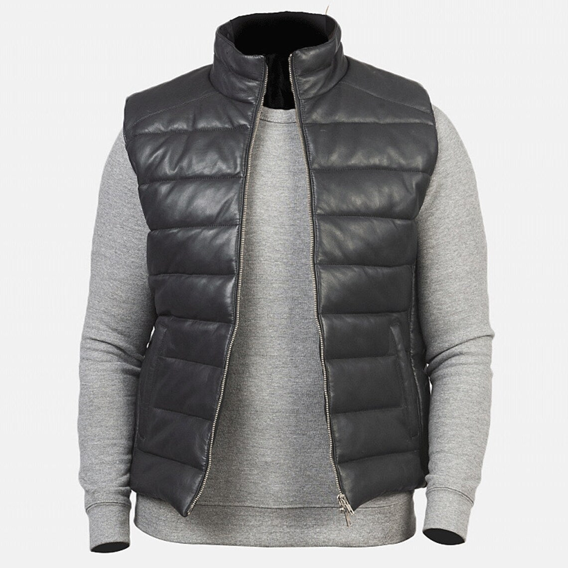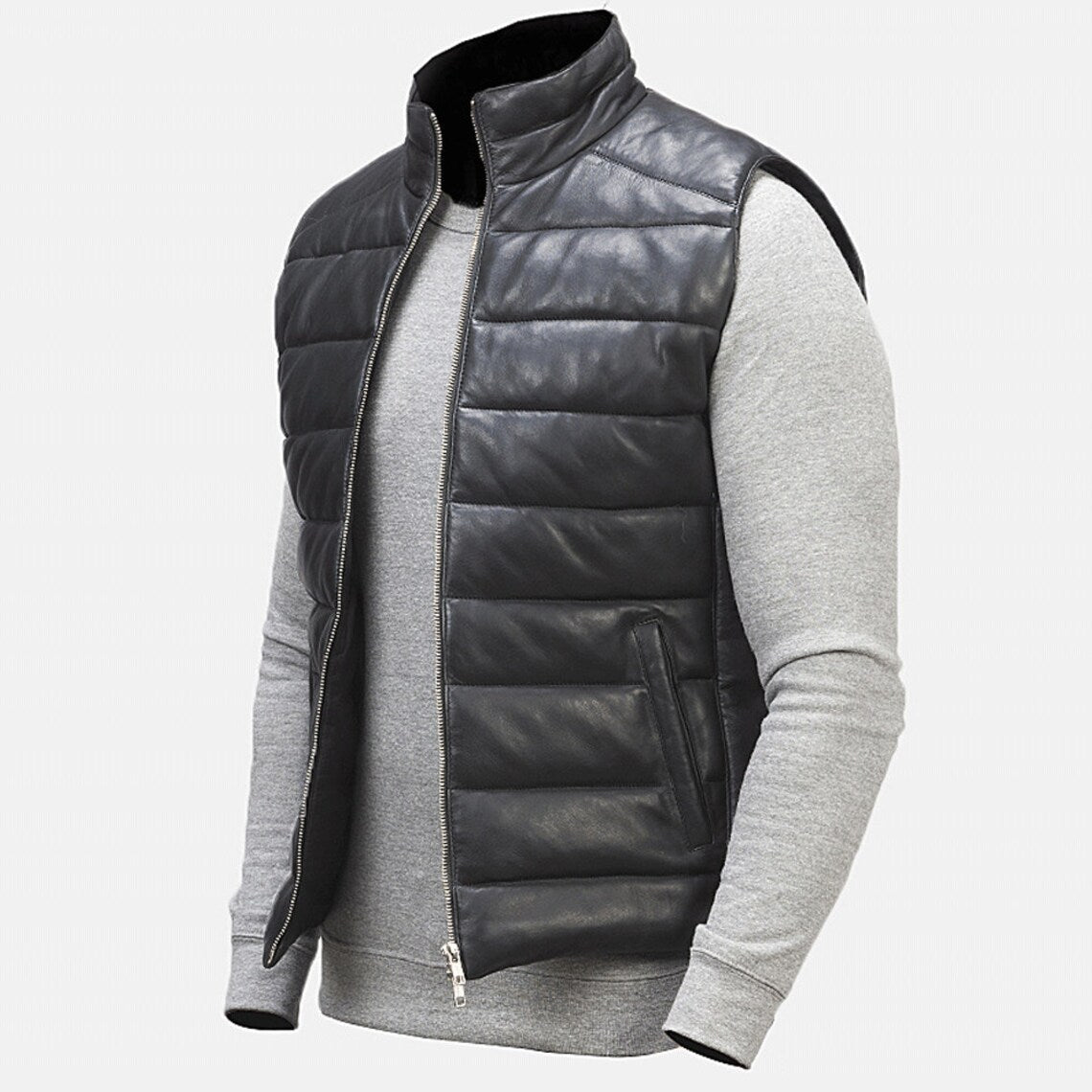 Men's Black Leather Puffer Vest with Zipper Closure and Side Pockets