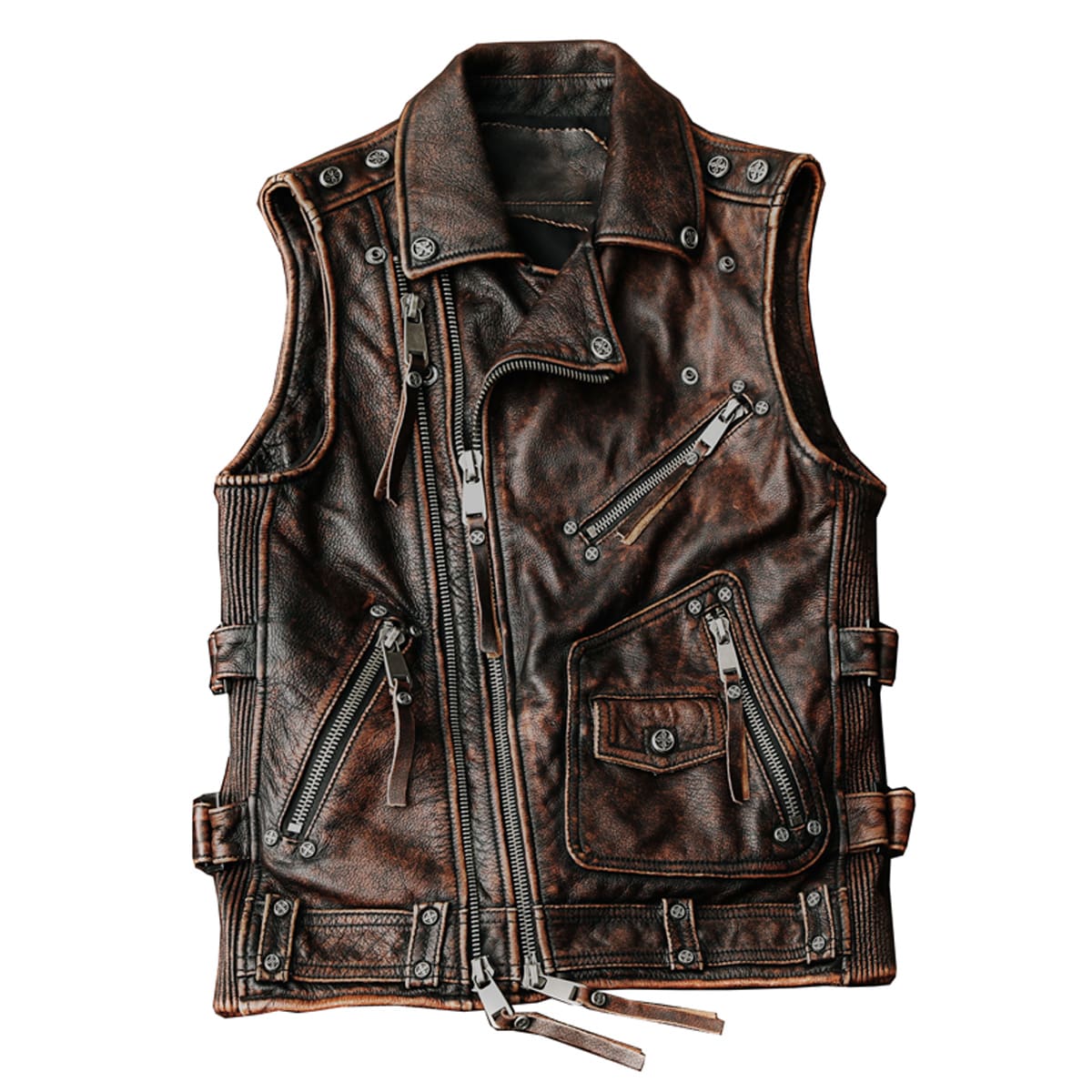 Men’s Biker Vintage Brown Genuine Cowhide Western Slim Fit Leather Zipper Waistcoat