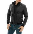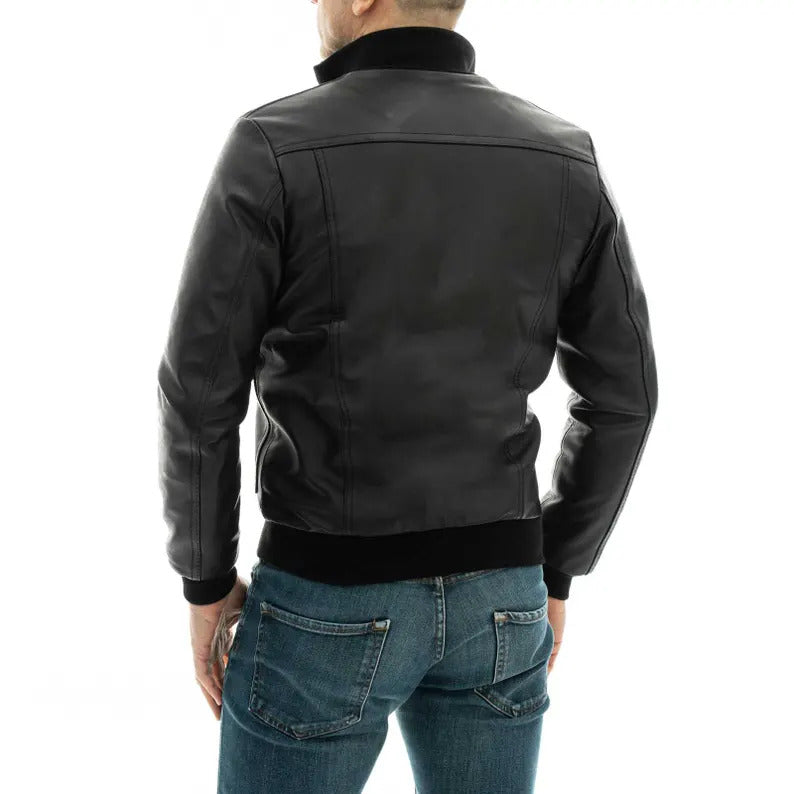 Men's Slim Fit Black Genuine Leather Bomber Jacket with Zip-Up Closure and Pockets