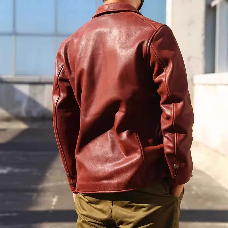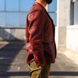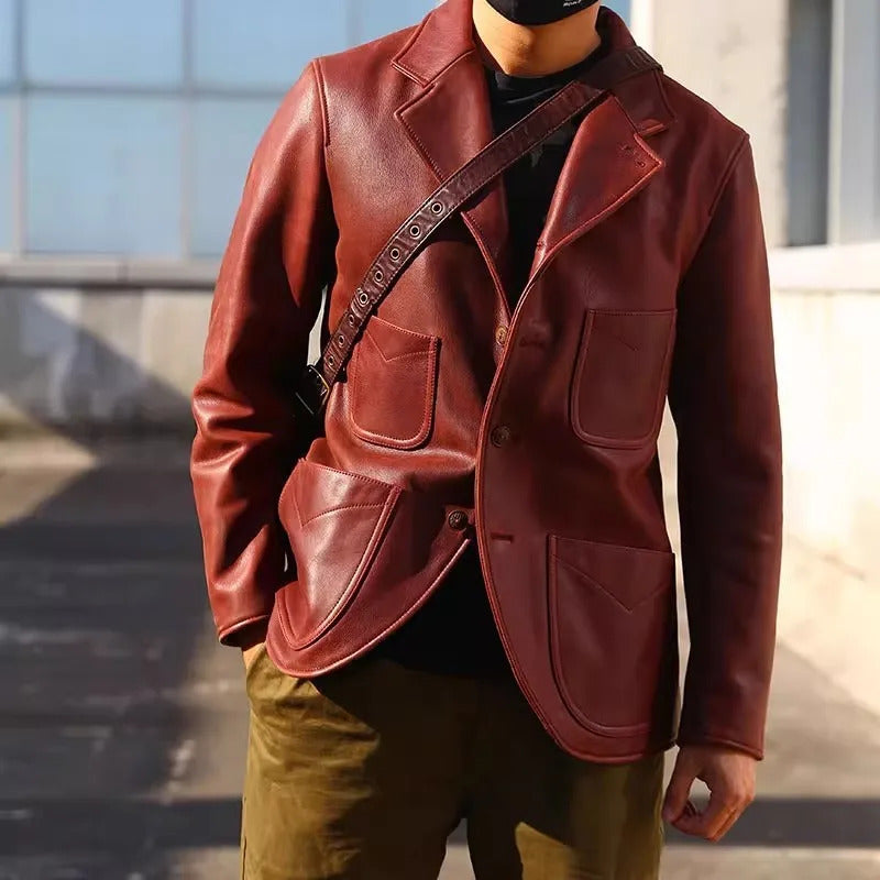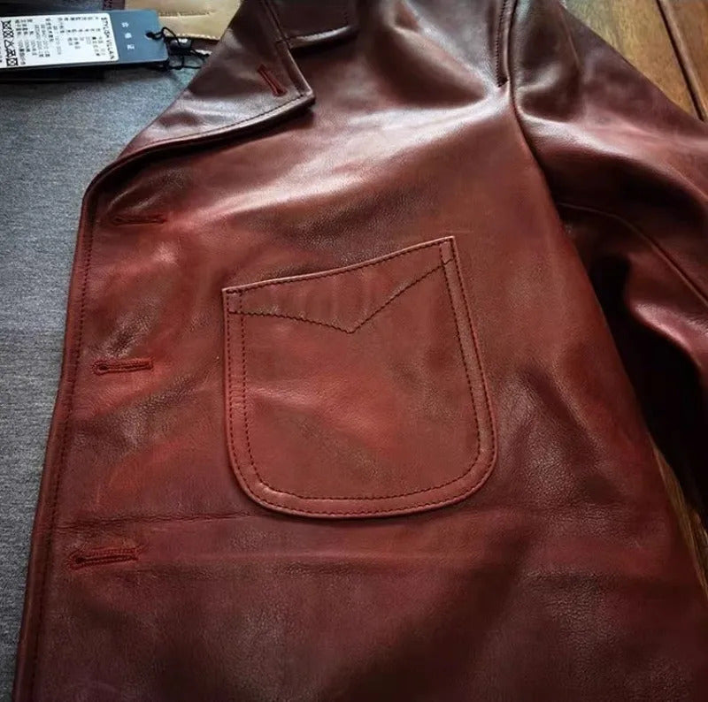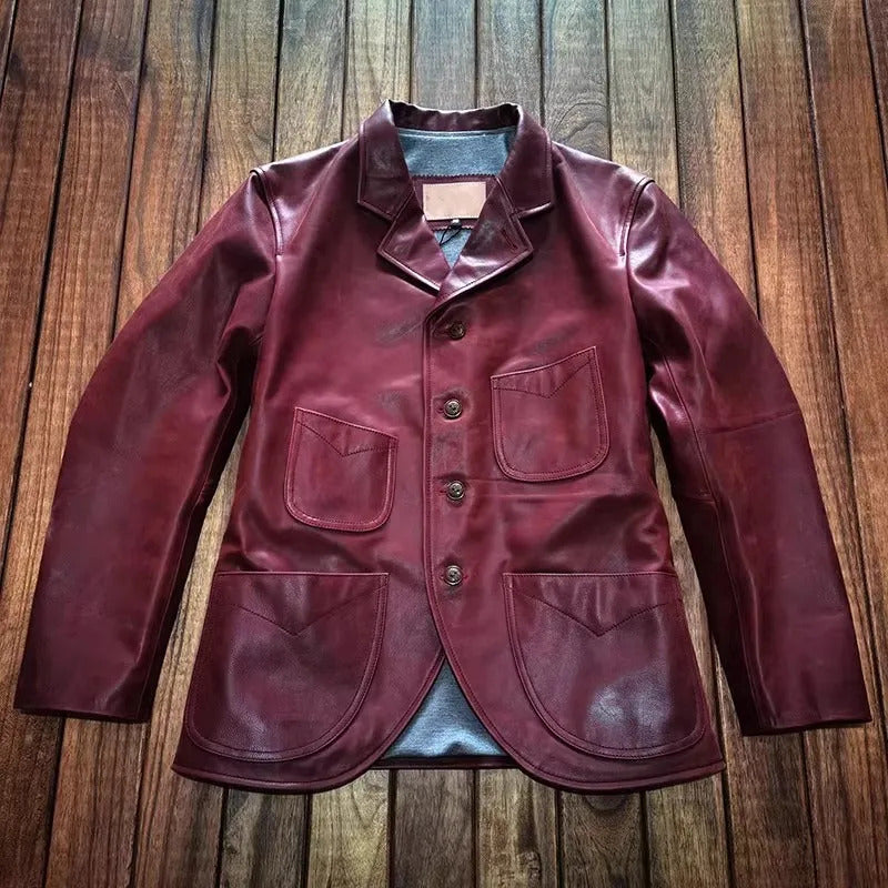 Men's Vintage Wine Red Oil Wax Cowhide Slim Fit Lapel Casual Suit Jacket