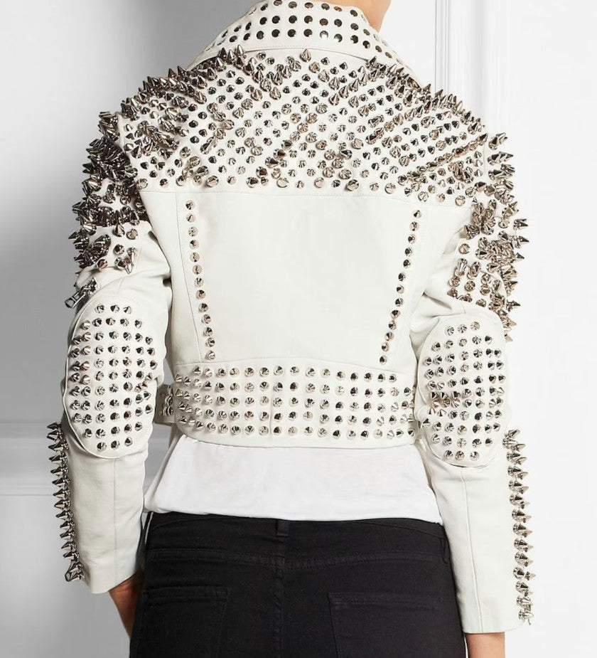 Trendy Style Women's Full White Punk Brando Spiked Studded Leather Jacket
