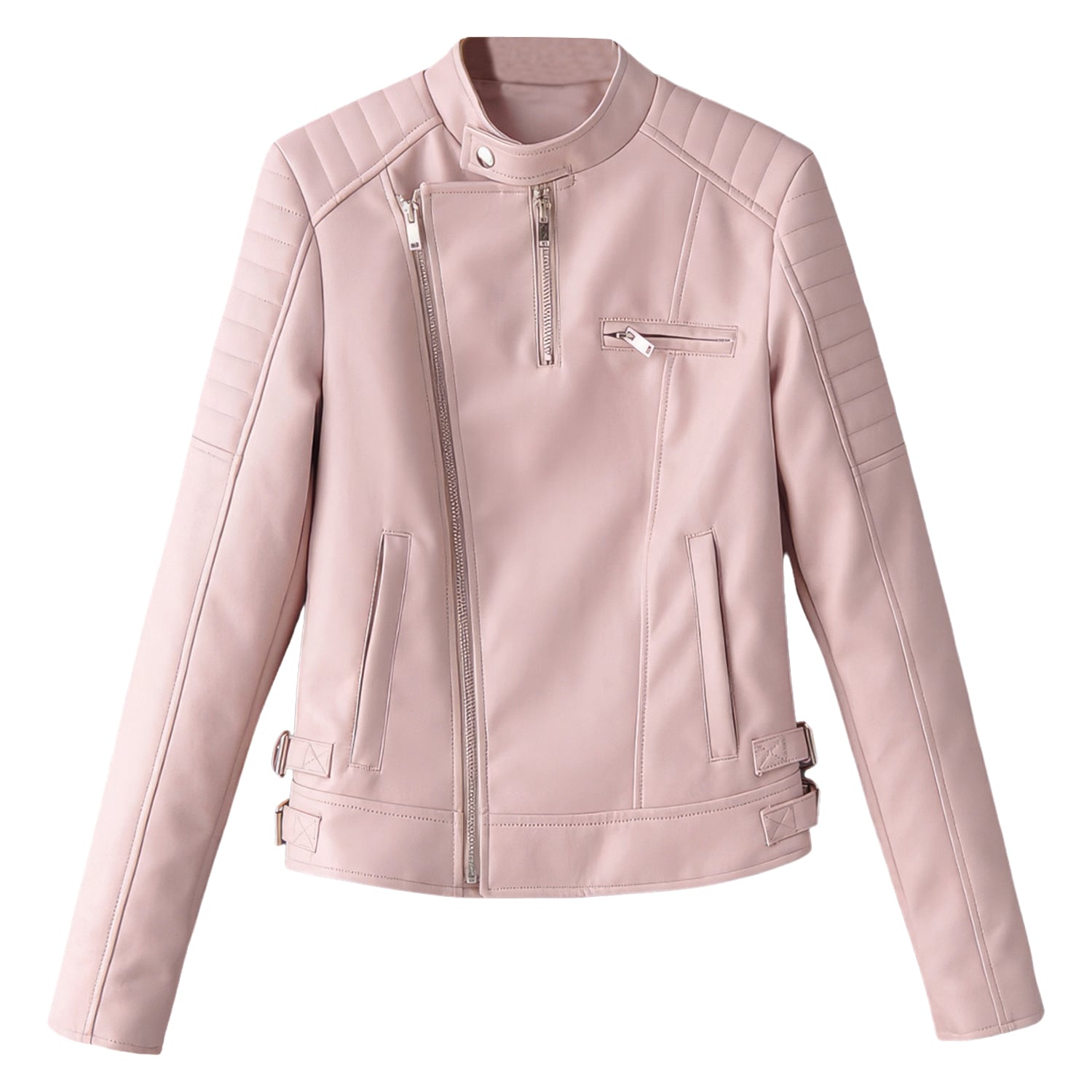 Women’s Baby Pink Biker Genuine Sheepskin Quilted Shoulders Moto Racer Sporty Slim Fit Crossover Asymmetric Leather Jacket