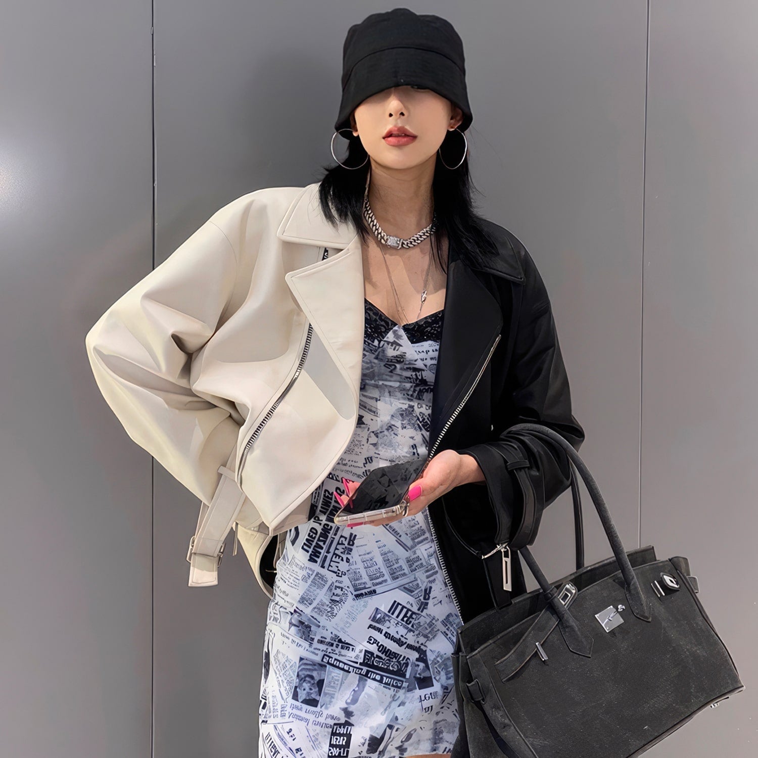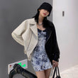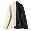 Women’s Black & Beige Genuine Sheepskin Lapel Collar Moto Biker Casual Classic Loose Oversized Café Racer Asymmetric Leather Jacket