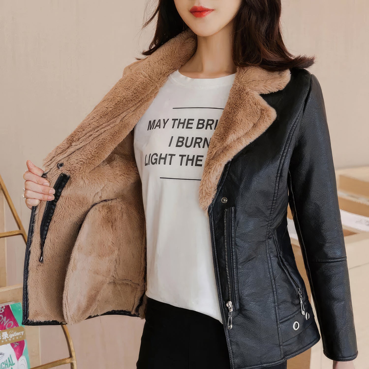 Women’s Black Biker Genuine Sheepskin Sherpa Shearling Faux Fur Lined Cafe Racer Korean Fashion Motorcycle Slim Fit Leather Jacket