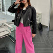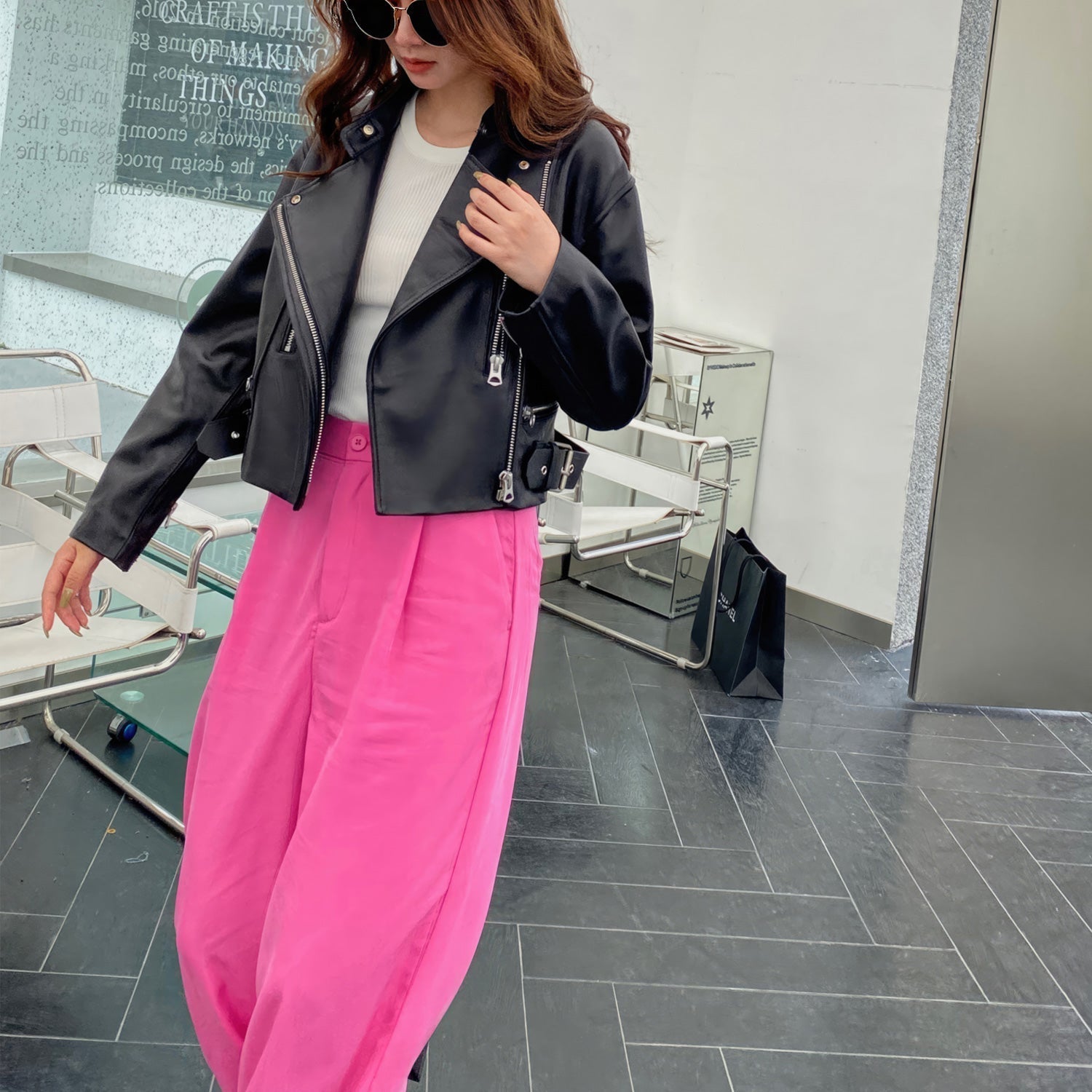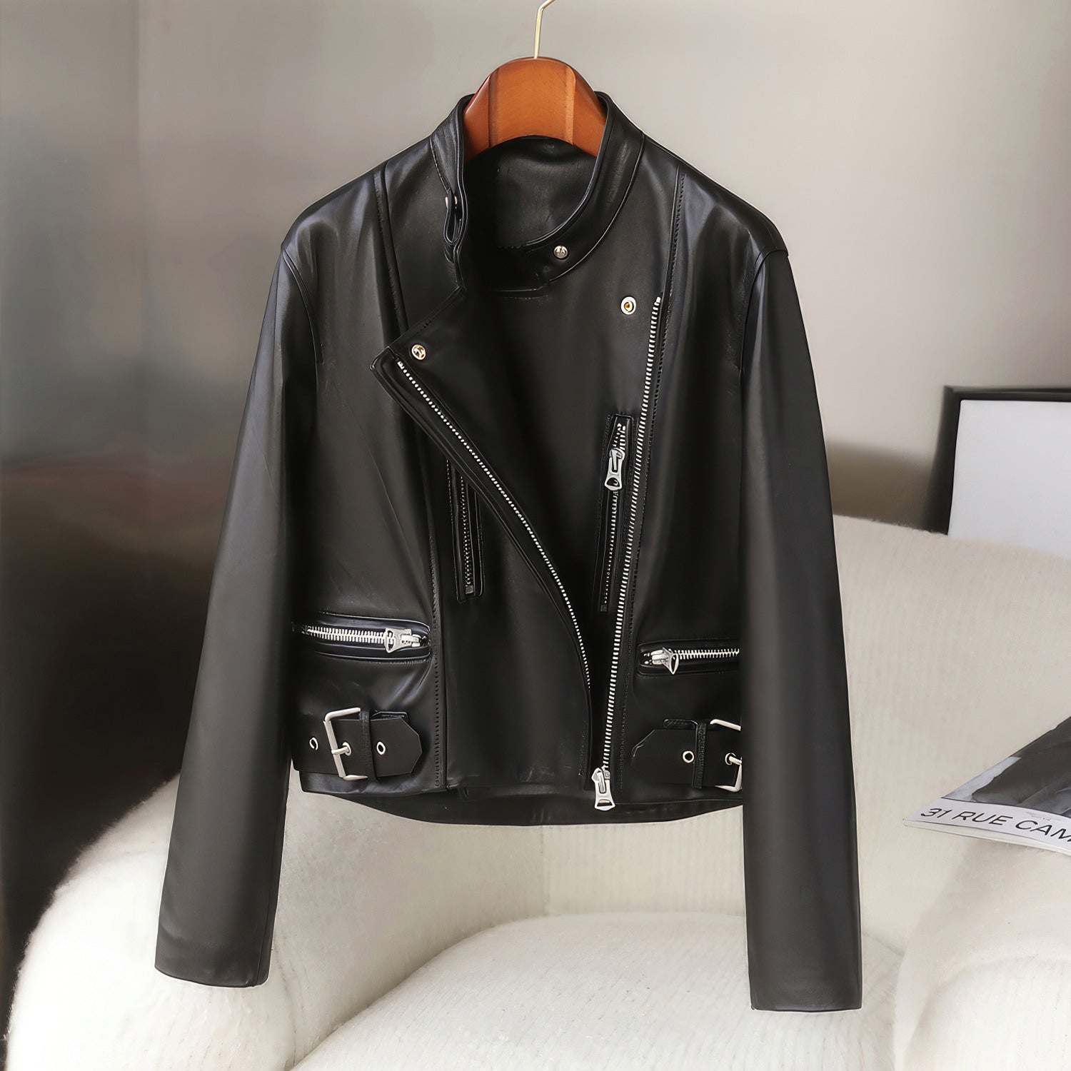 Women’s Black Biker Genuine Sheepskin Stand Collar Crossover Café Racer Classic Motorcycle Rider Slim Fit Leather Jacket