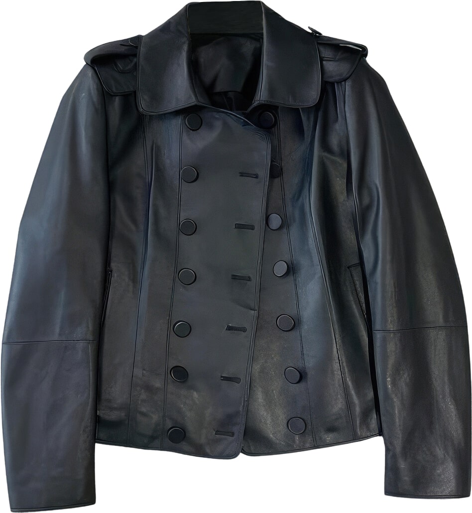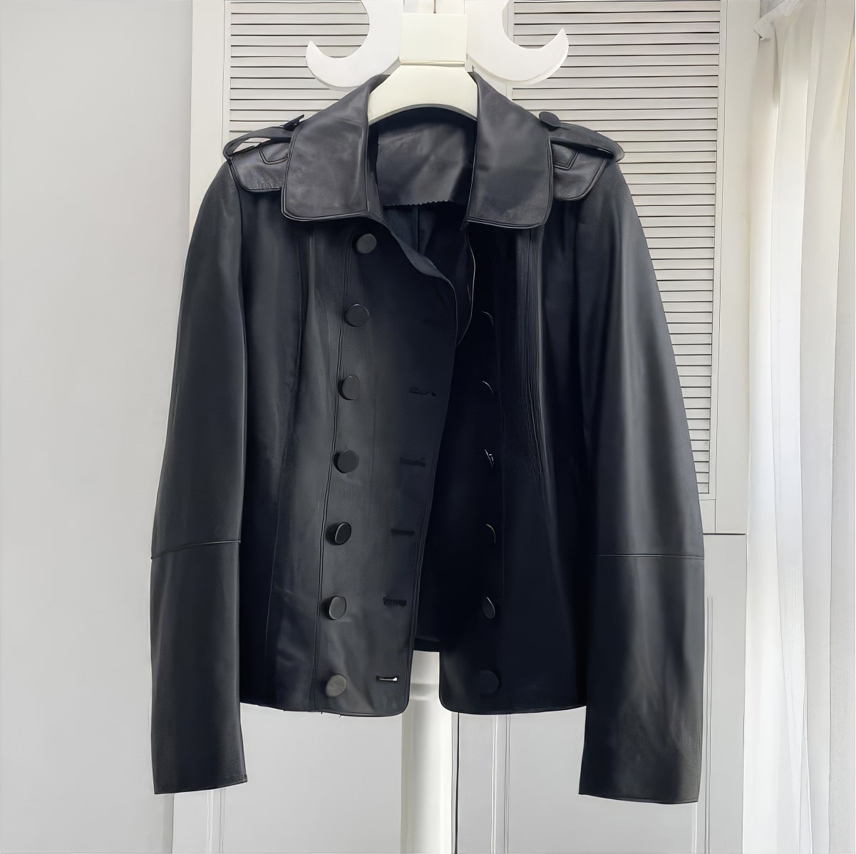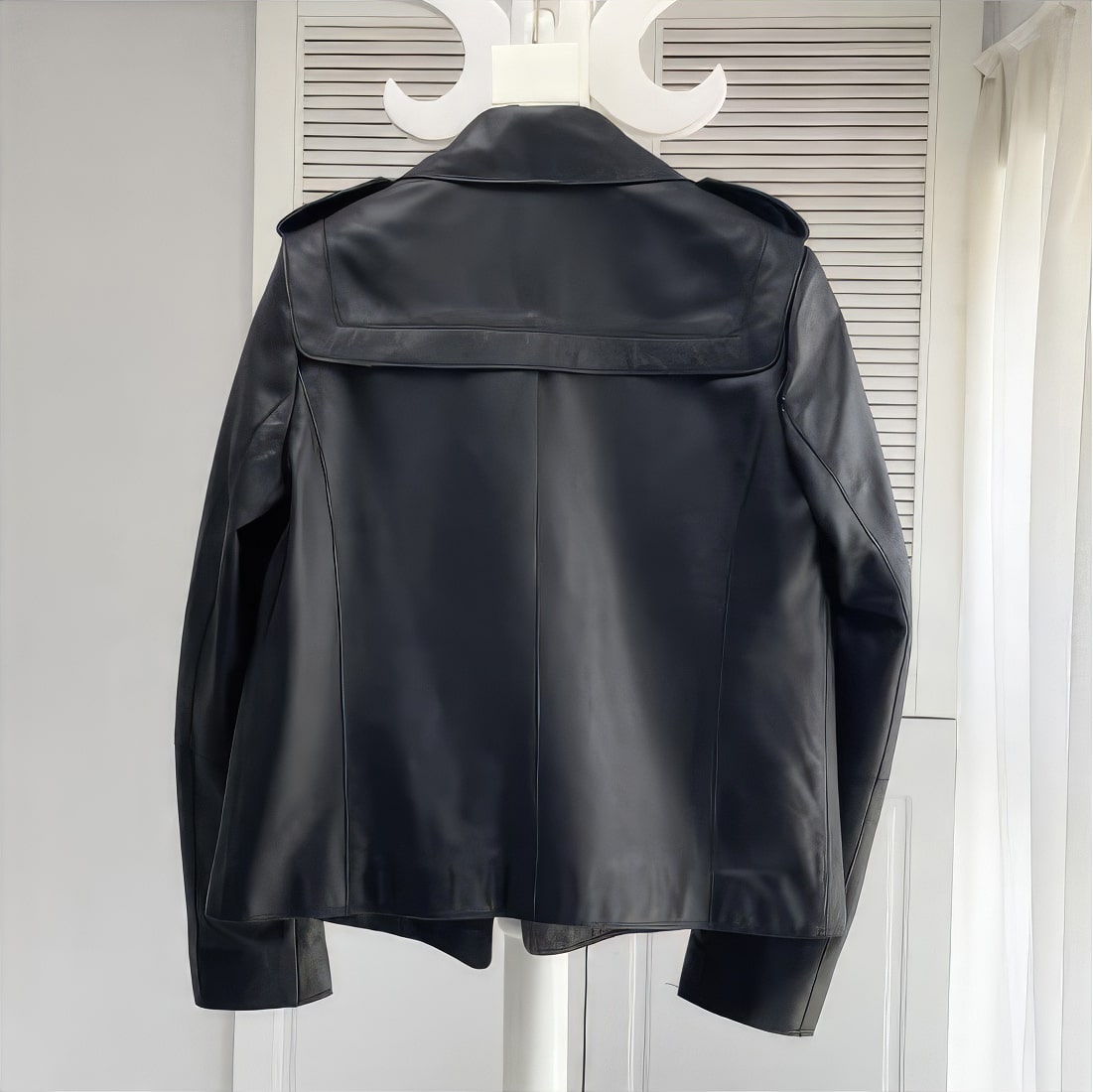 Women’s Black Genuine Sheepskin Double Breasted Winter Vintage Korean Fashion Chic Outfit Trendy Plain Leather Jacket