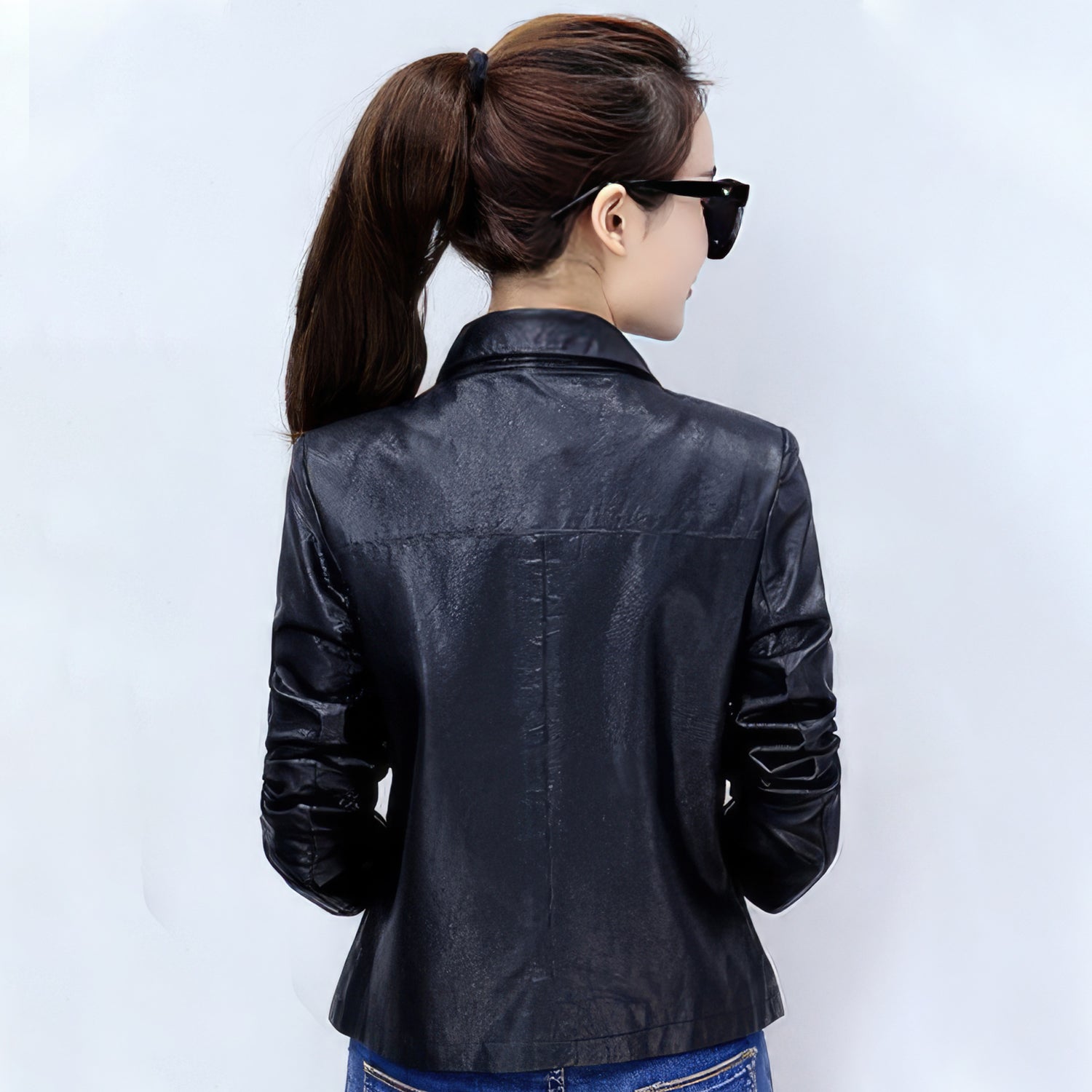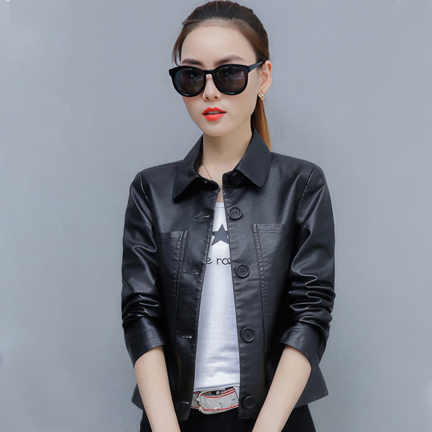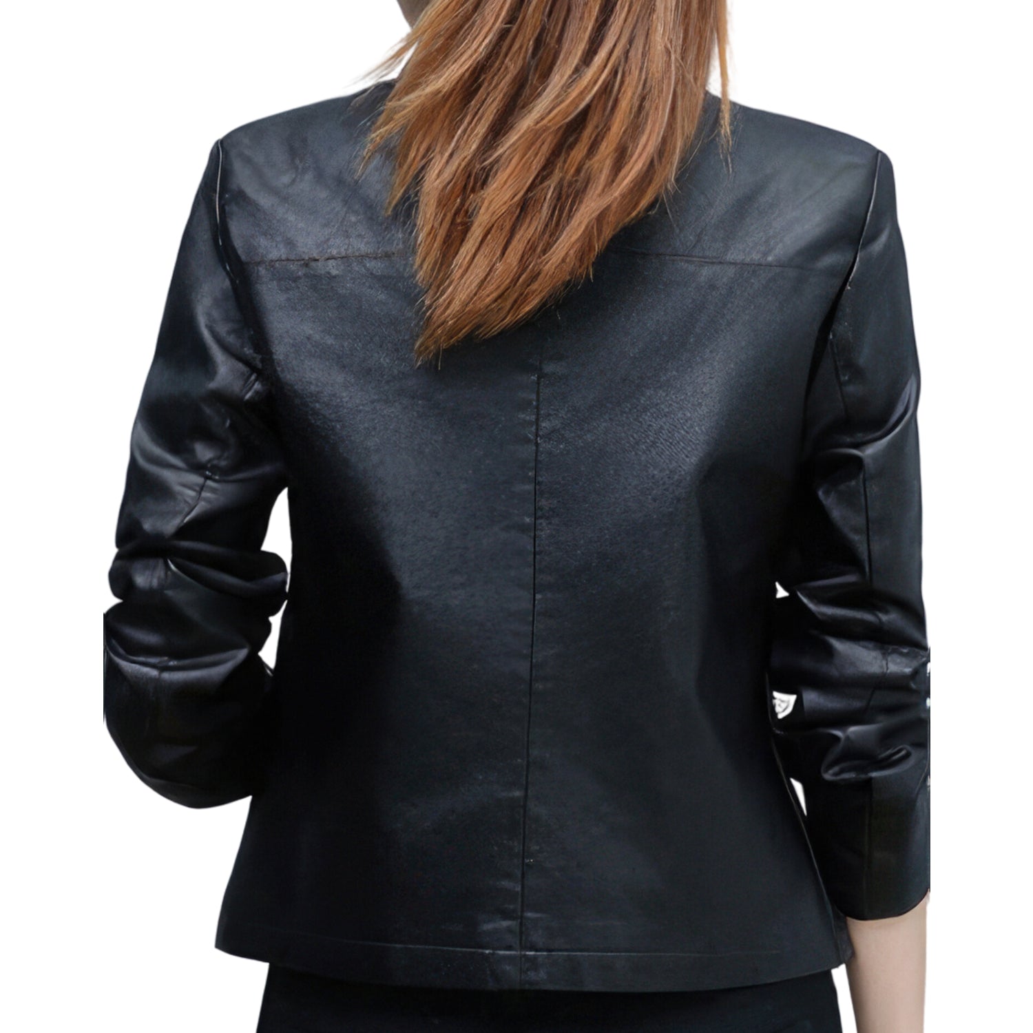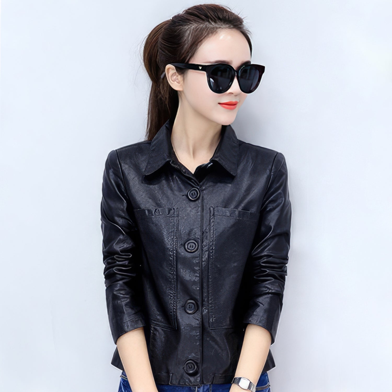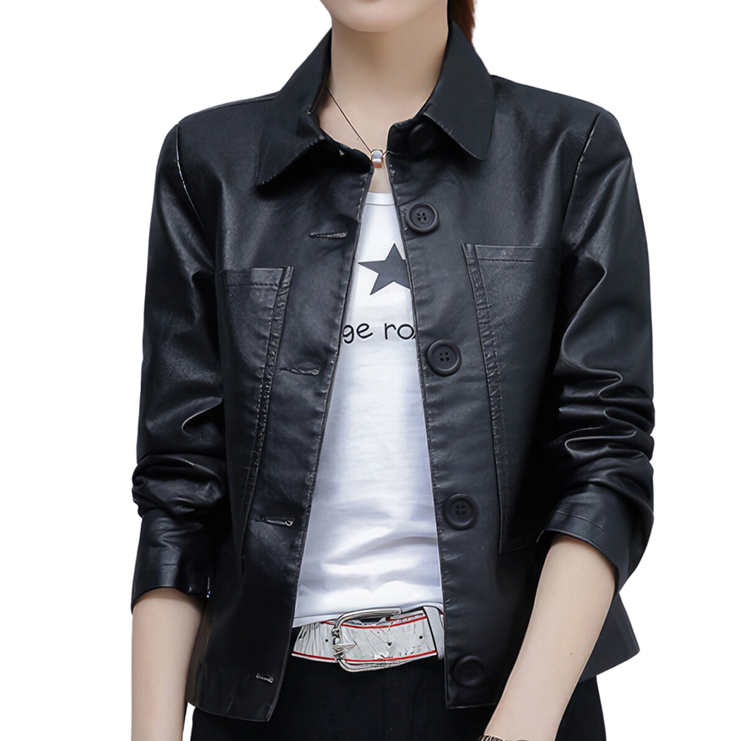 Women’s Black Genuine Sheepskin Shirt Collar Moto Café Racer Sporty Korean Fashion Chic Slim Fit Leather Jacket