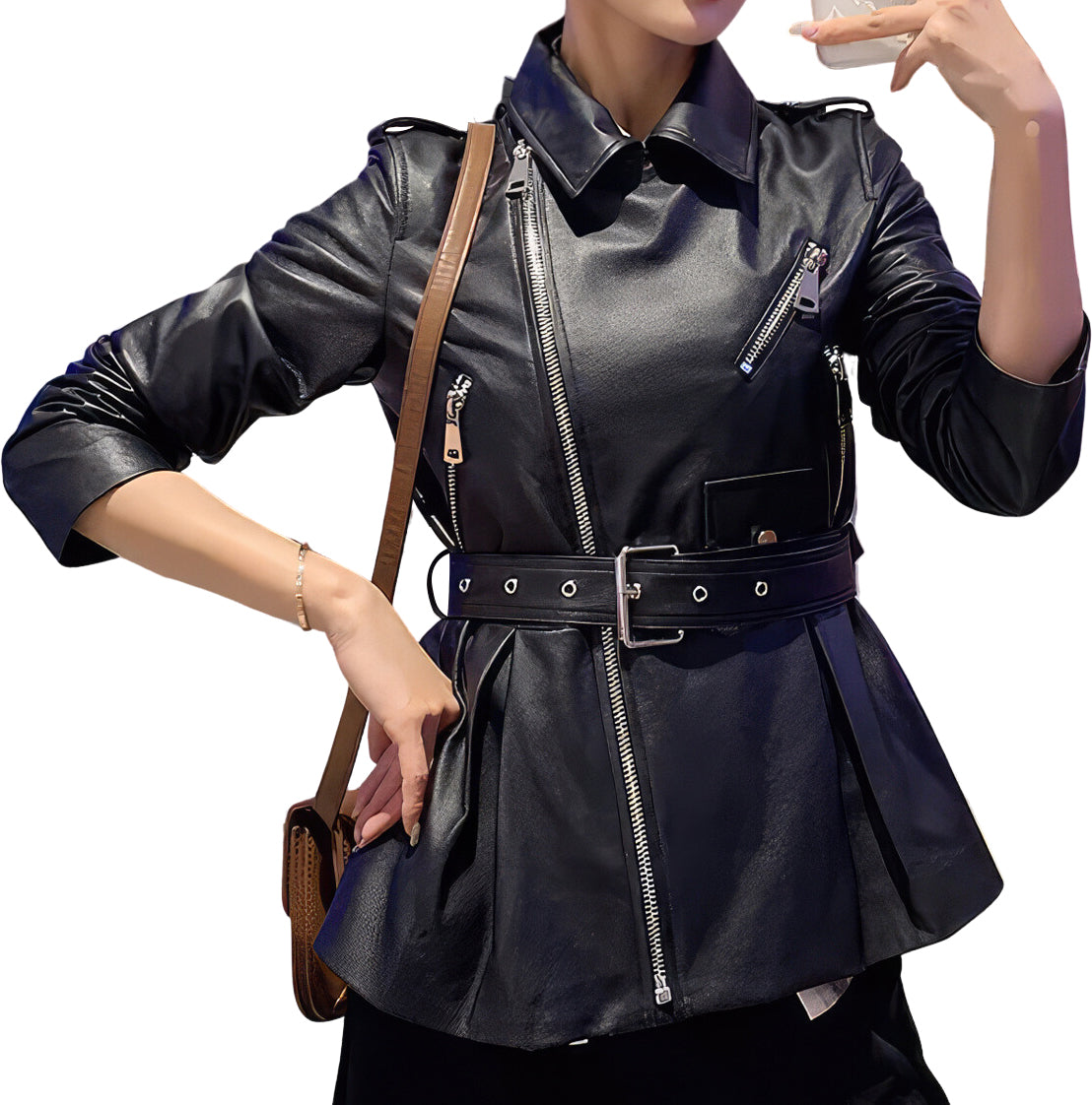 Women’s Black Genuine Sheepskin Suit Collar Motorcycle Pleated Korean Style Asymmetric Crossover Winter Leather Jacket