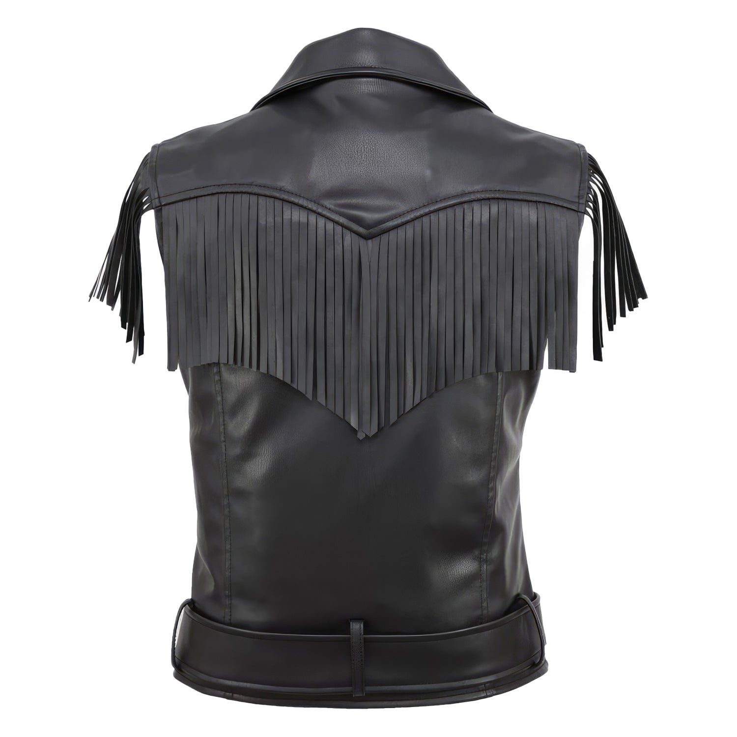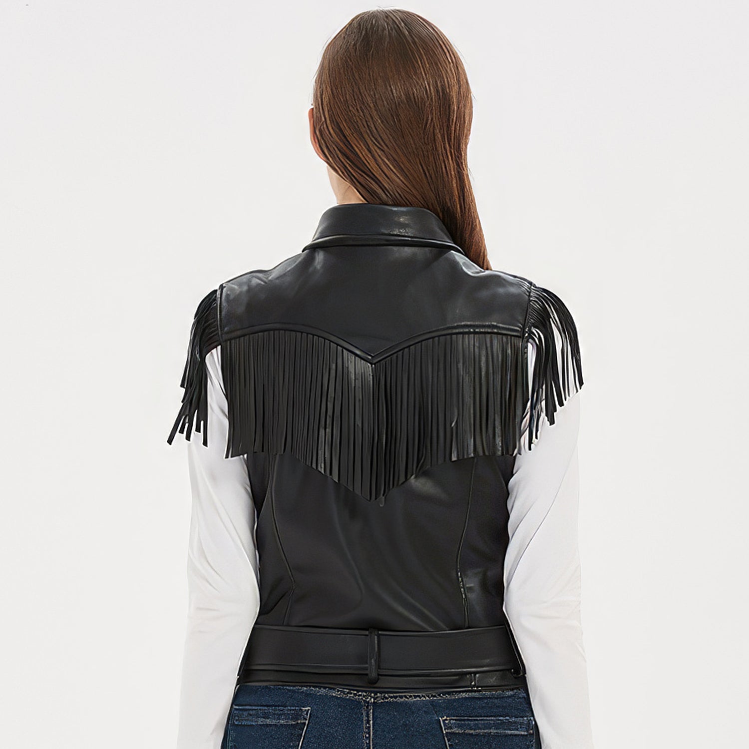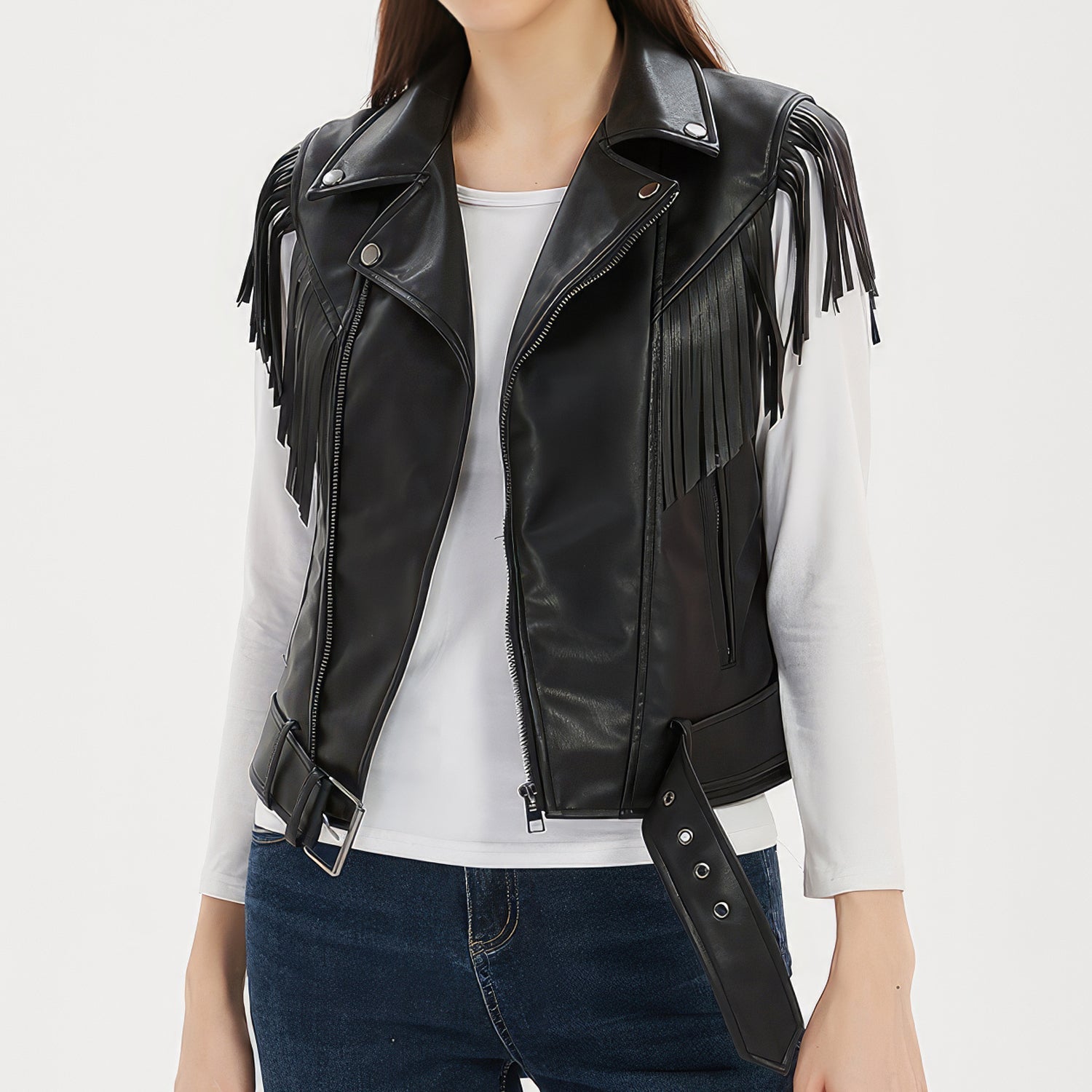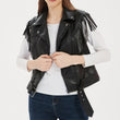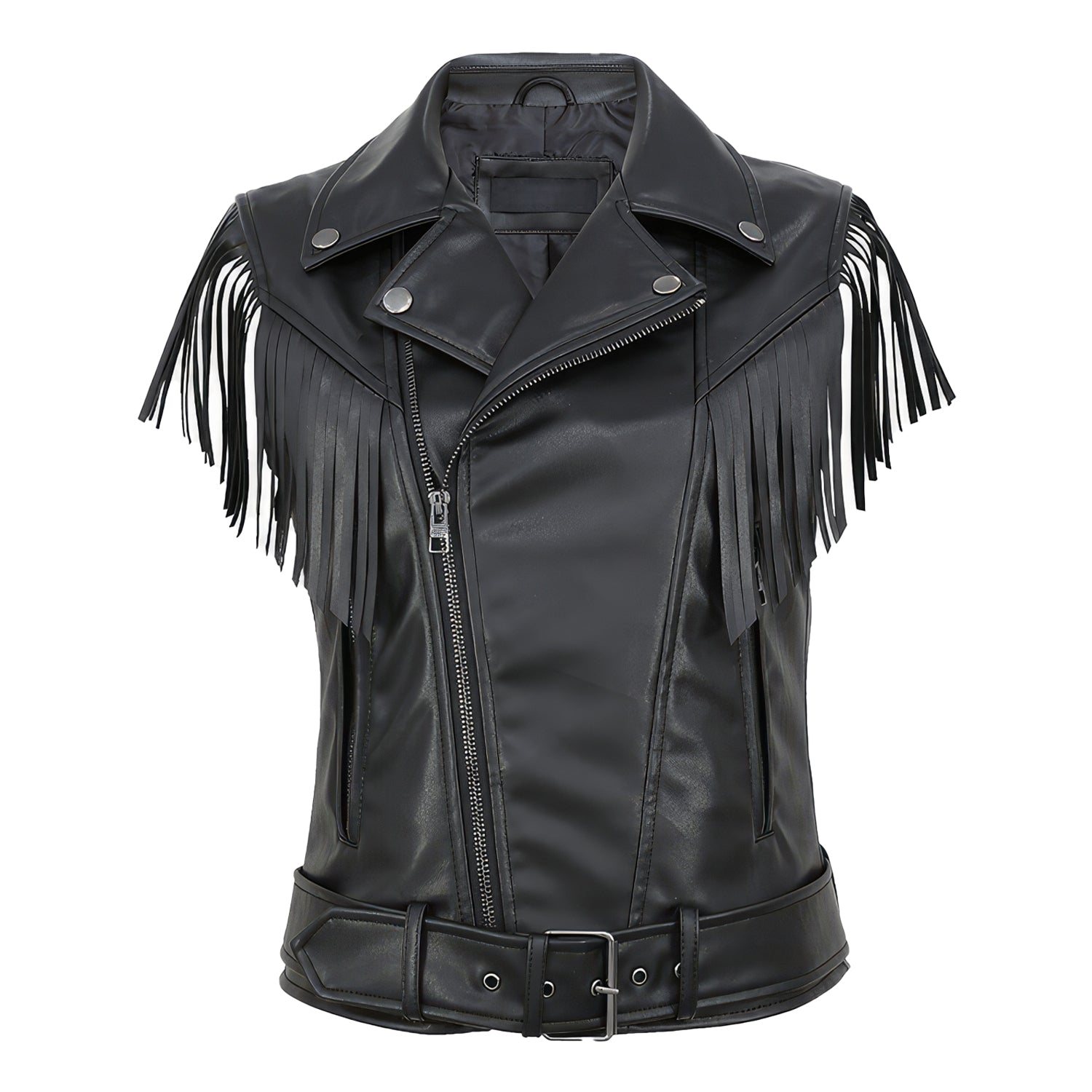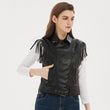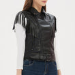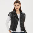 Women’s Black Genuine Sheepskin Vest Tassels Sleeveless Sporty Moto Rider Mid-Western Slim Fit Fringe Leather Waistcoat