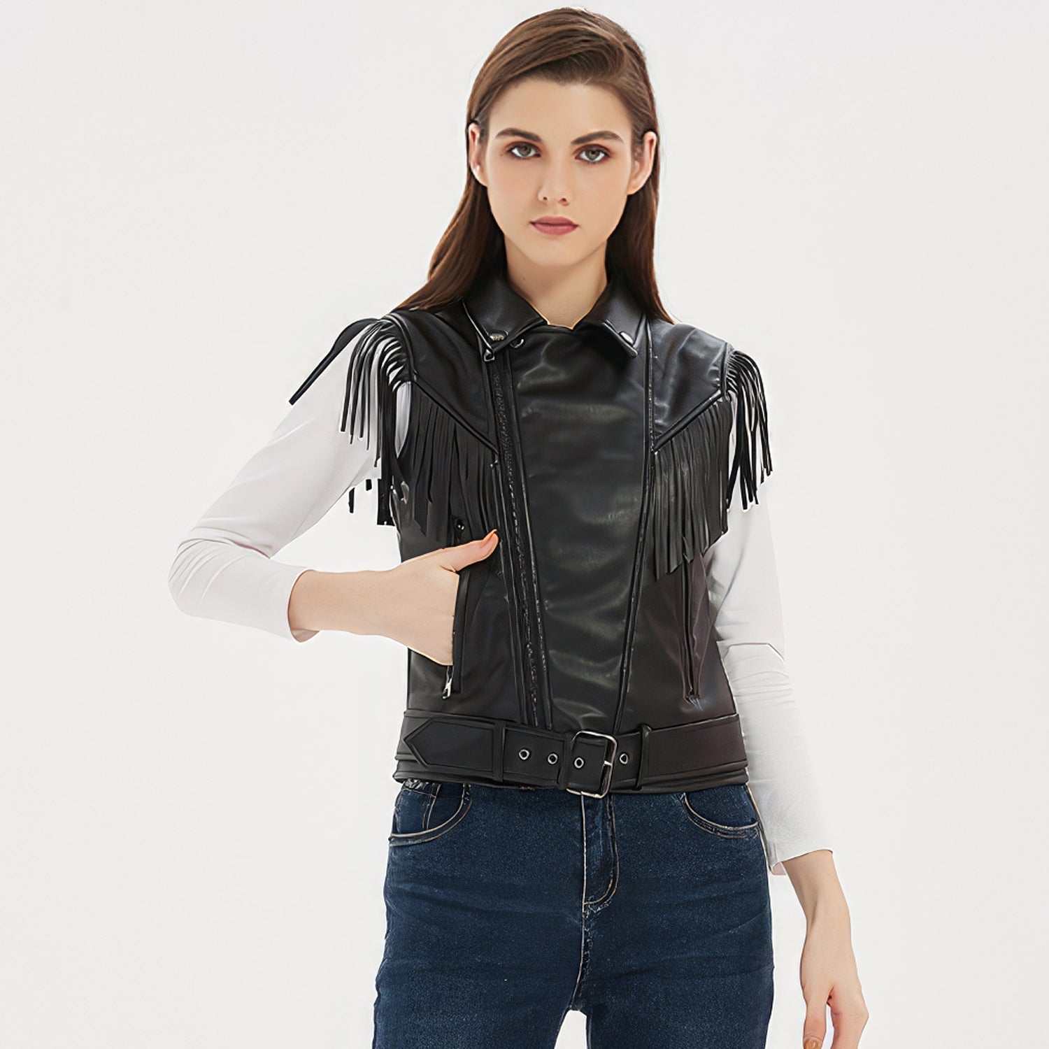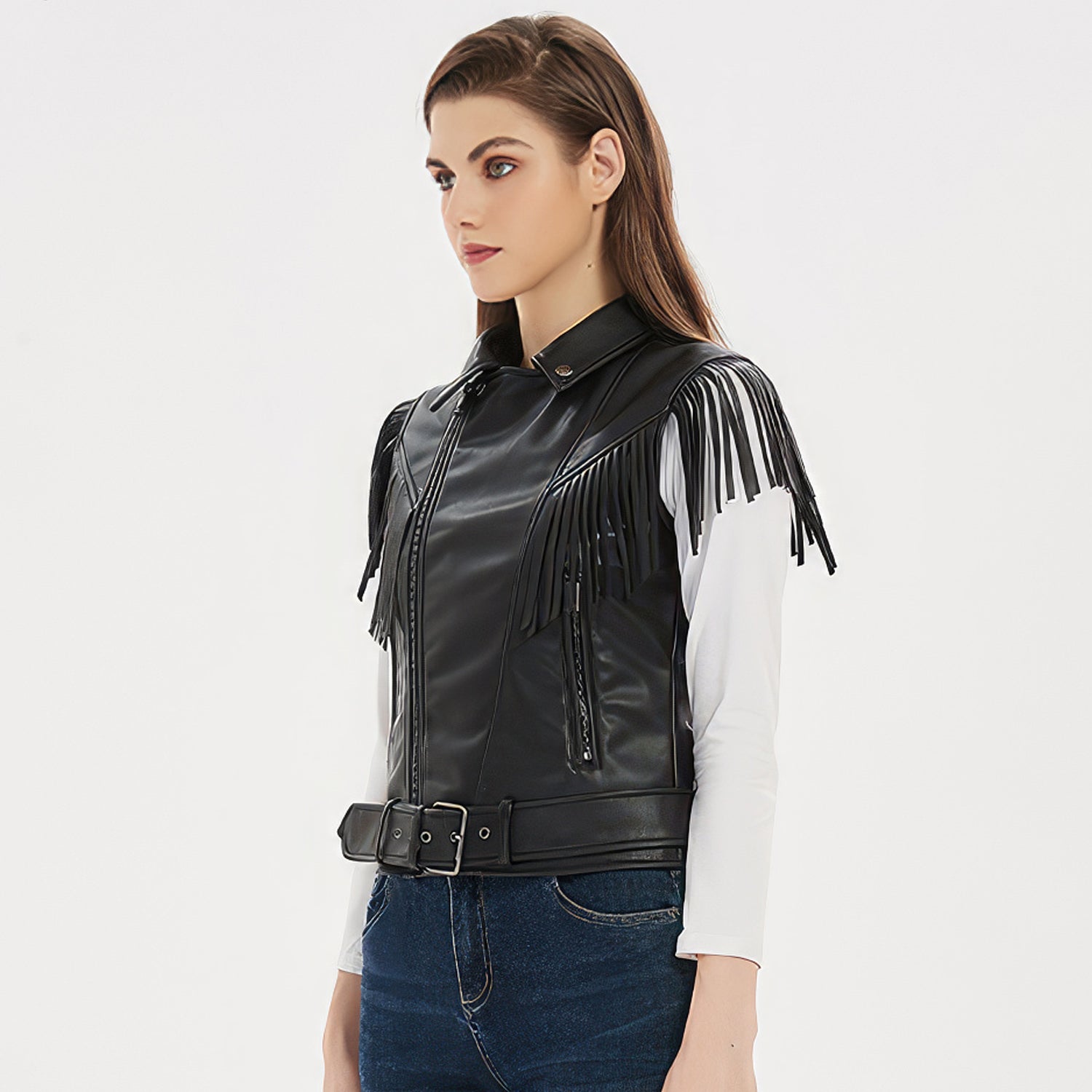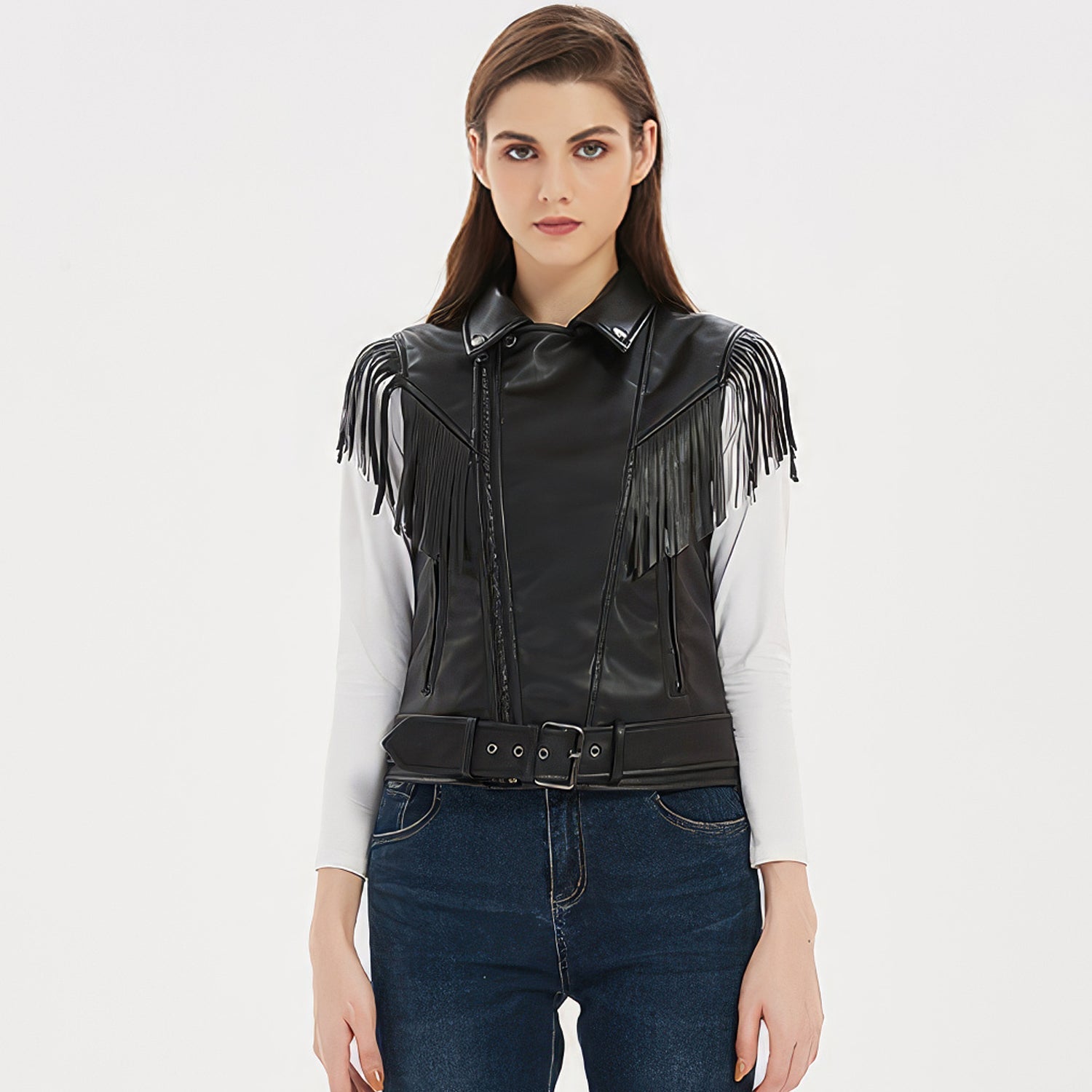 Women’s Black Genuine Sheepskin Vest Tassels Sleeveless Sporty Moto Rider Mid-Western Slim Fit Fringe Leather Waistcoat