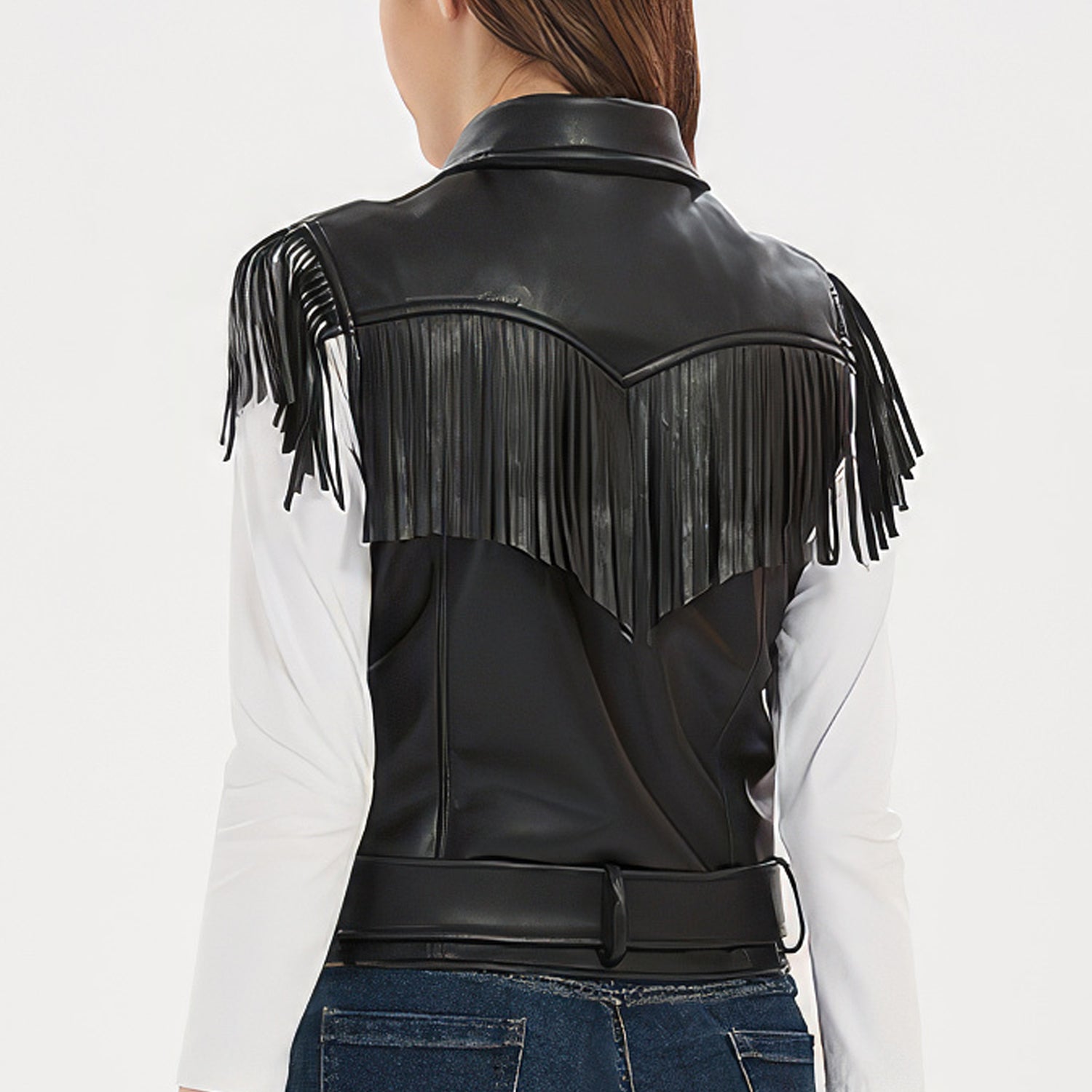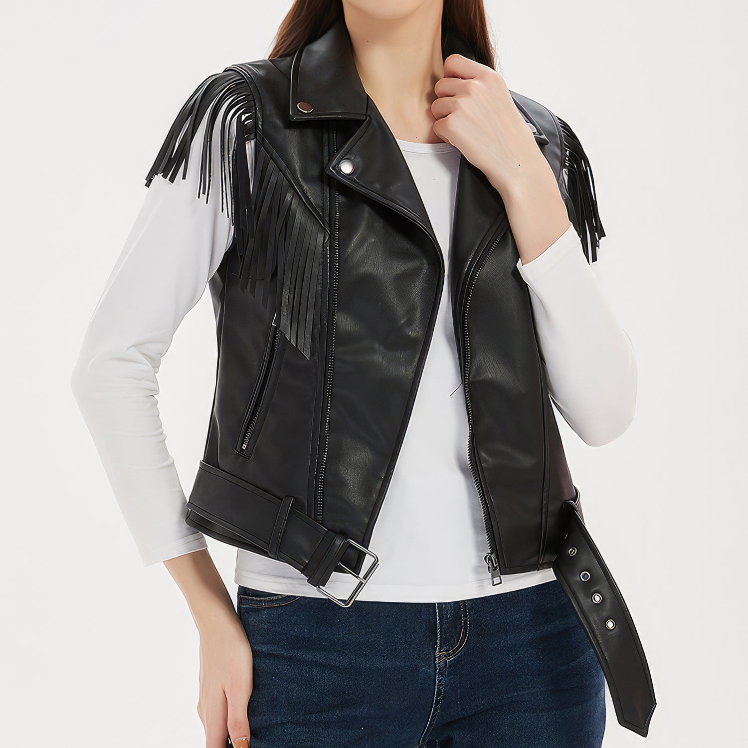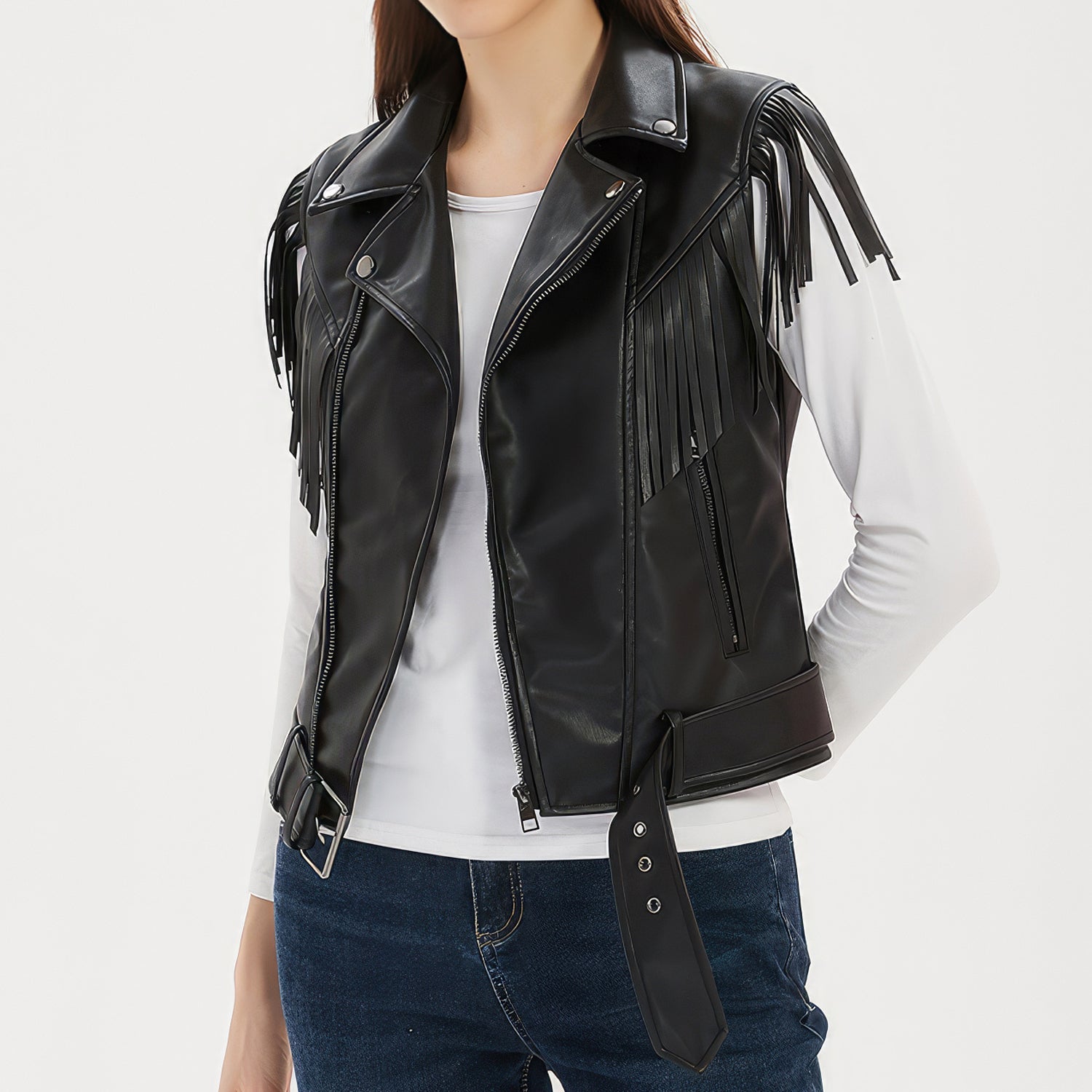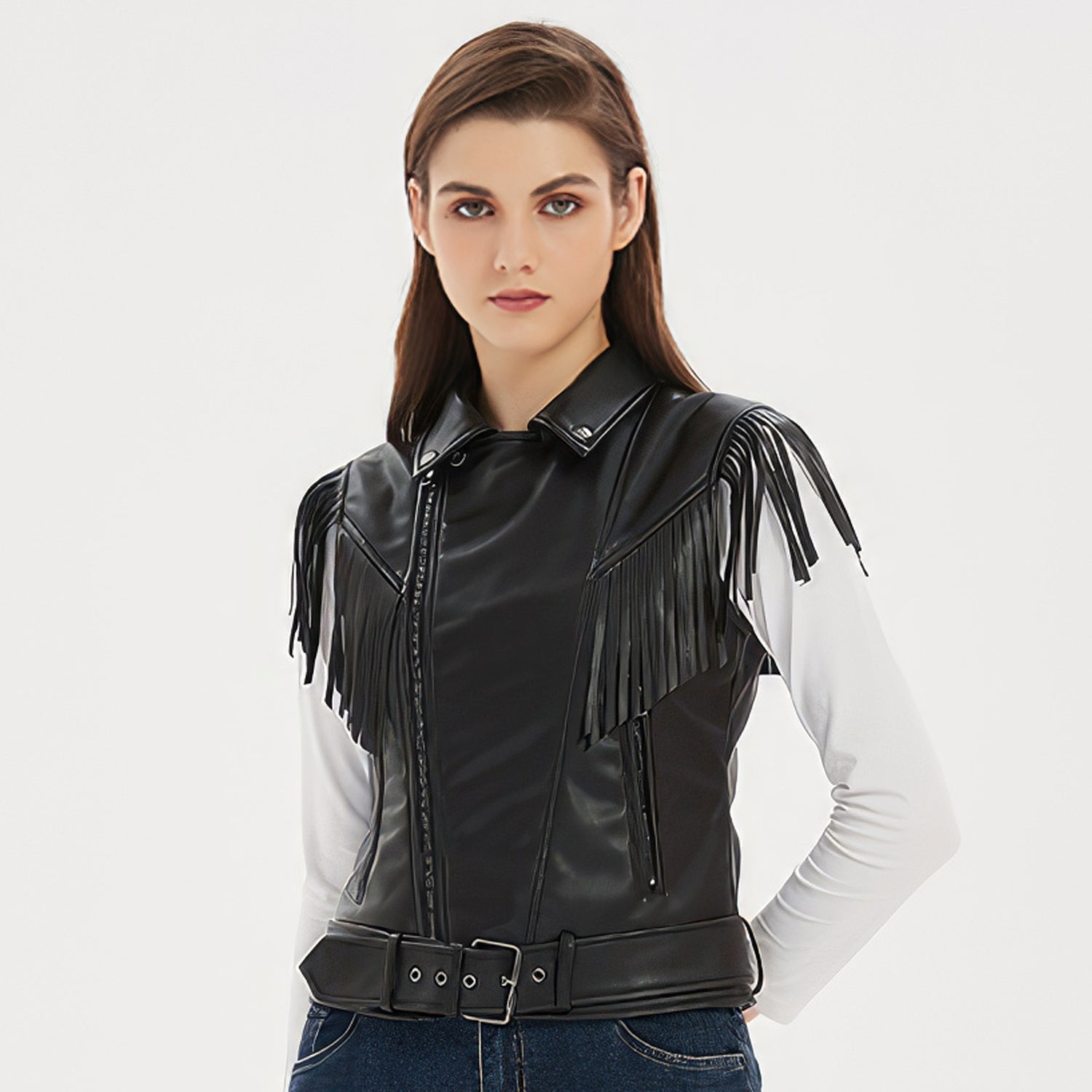 Women’s Black Genuine Sheepskin Vest Tassels Sleeveless Sporty Moto Rider Mid-Western Slim Fit Fringe Leather Waistcoat