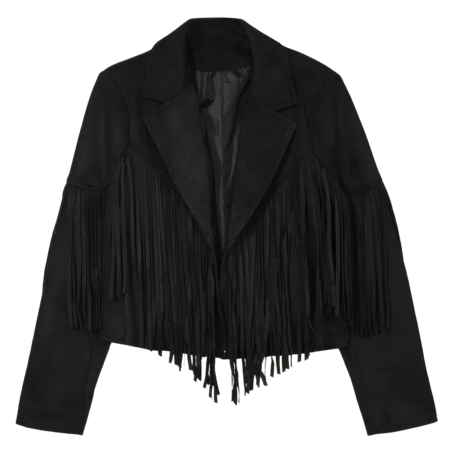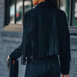 Women’s Black Genuine Suede Tassel Lapel Long Sleeve Motor Biker Native American Vintage Cropped Leather Jacket