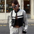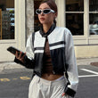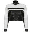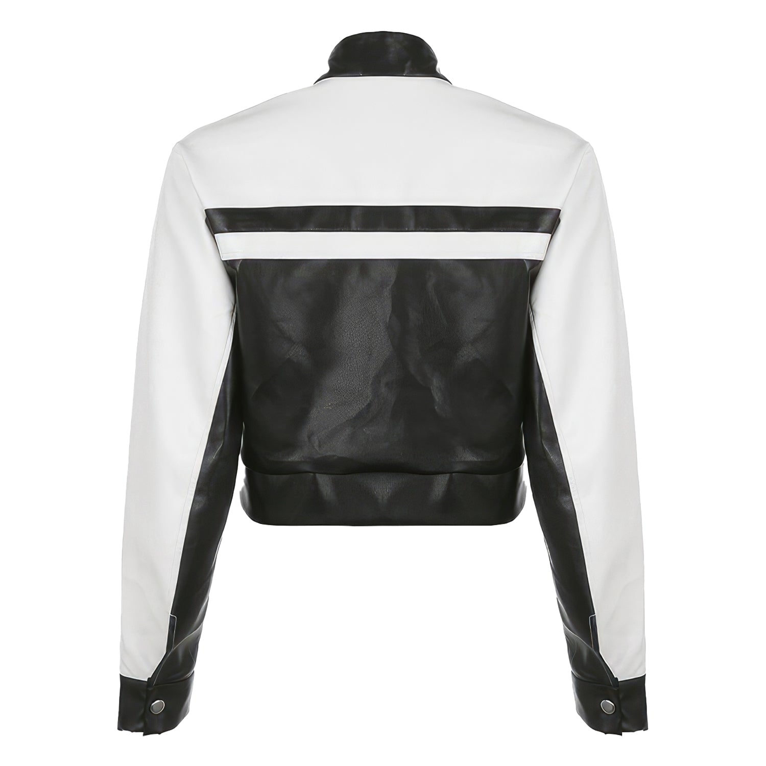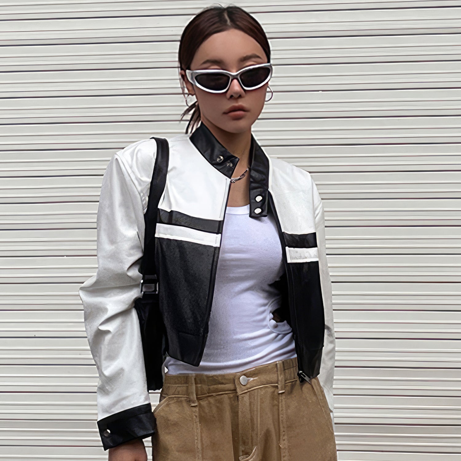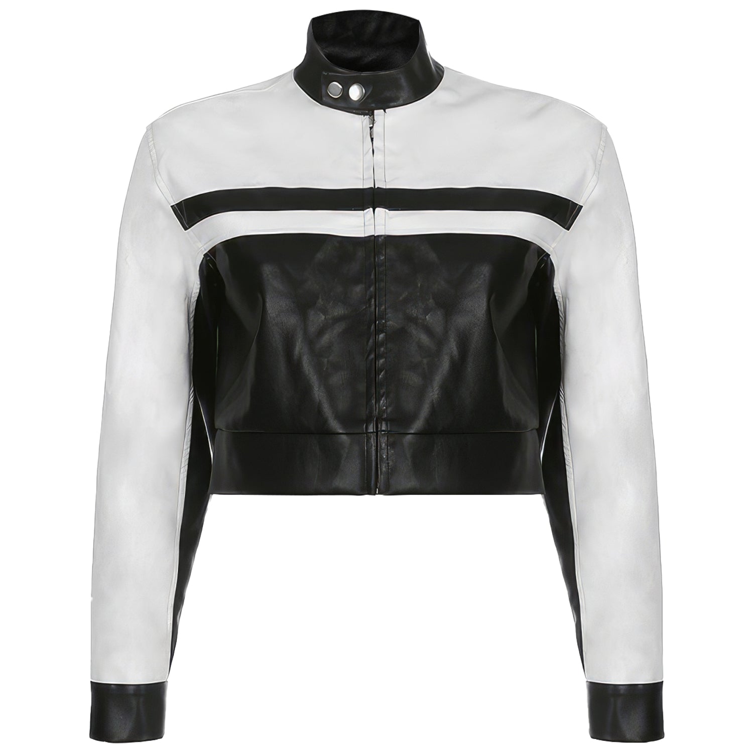 Women’s Black White Biker Genuine Sheepskin Stand Collar Oversized Cropped Top Hip Hop Punk Style Sporty Racer Leather Jacket