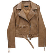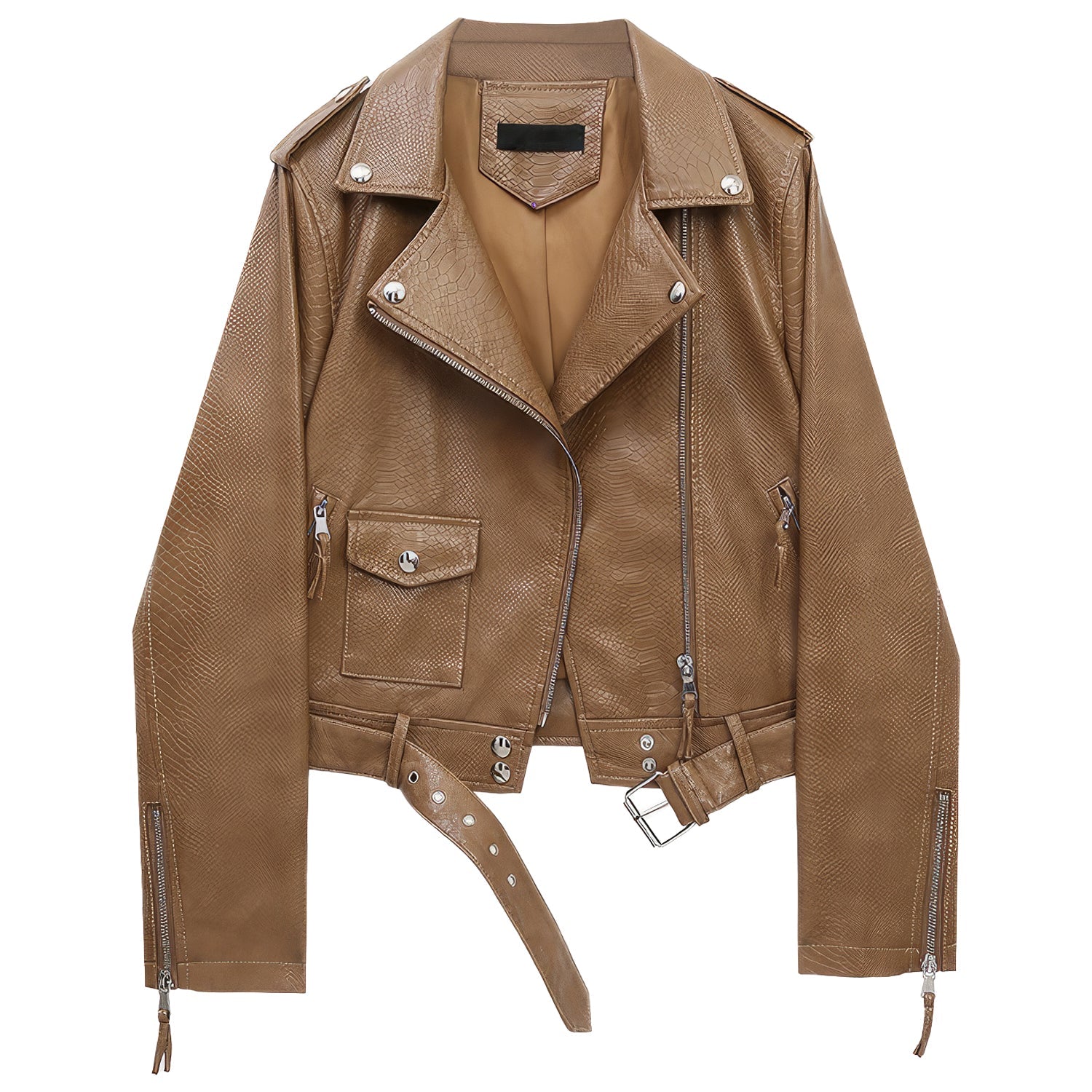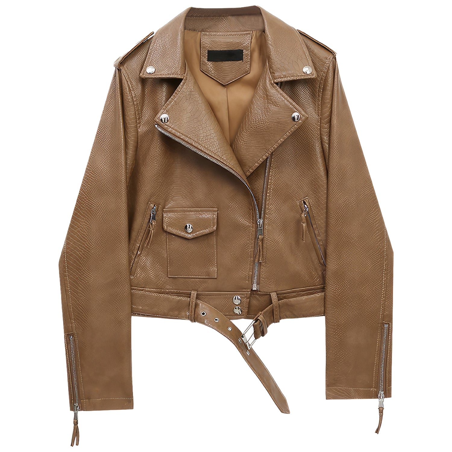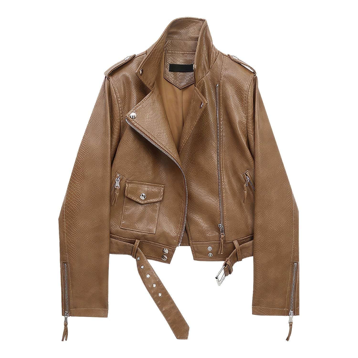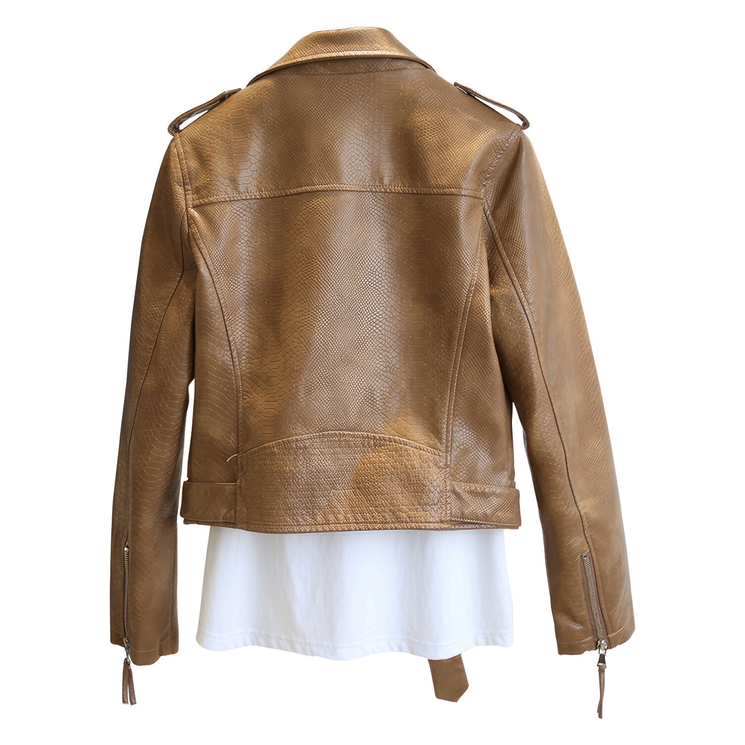 Women’s Brown Biker Genuine Sheepskin Snake Skin Texture Streetwear Slim Fit Moto Rider Casual Café Racer Smooth Leather Jacket