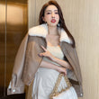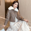 Women’s Brown Genuine Sheepskin Sherpa Shearling Faux Fur Lined Korean Style Oversized Winter Warm Motorcycle Leather Jacket