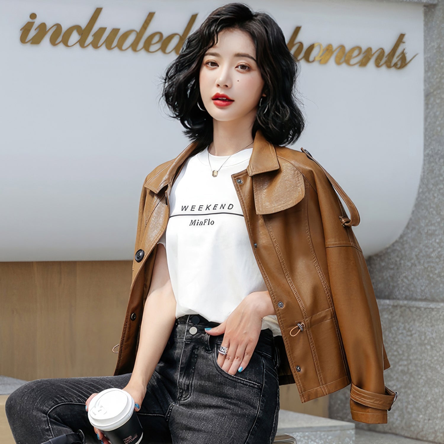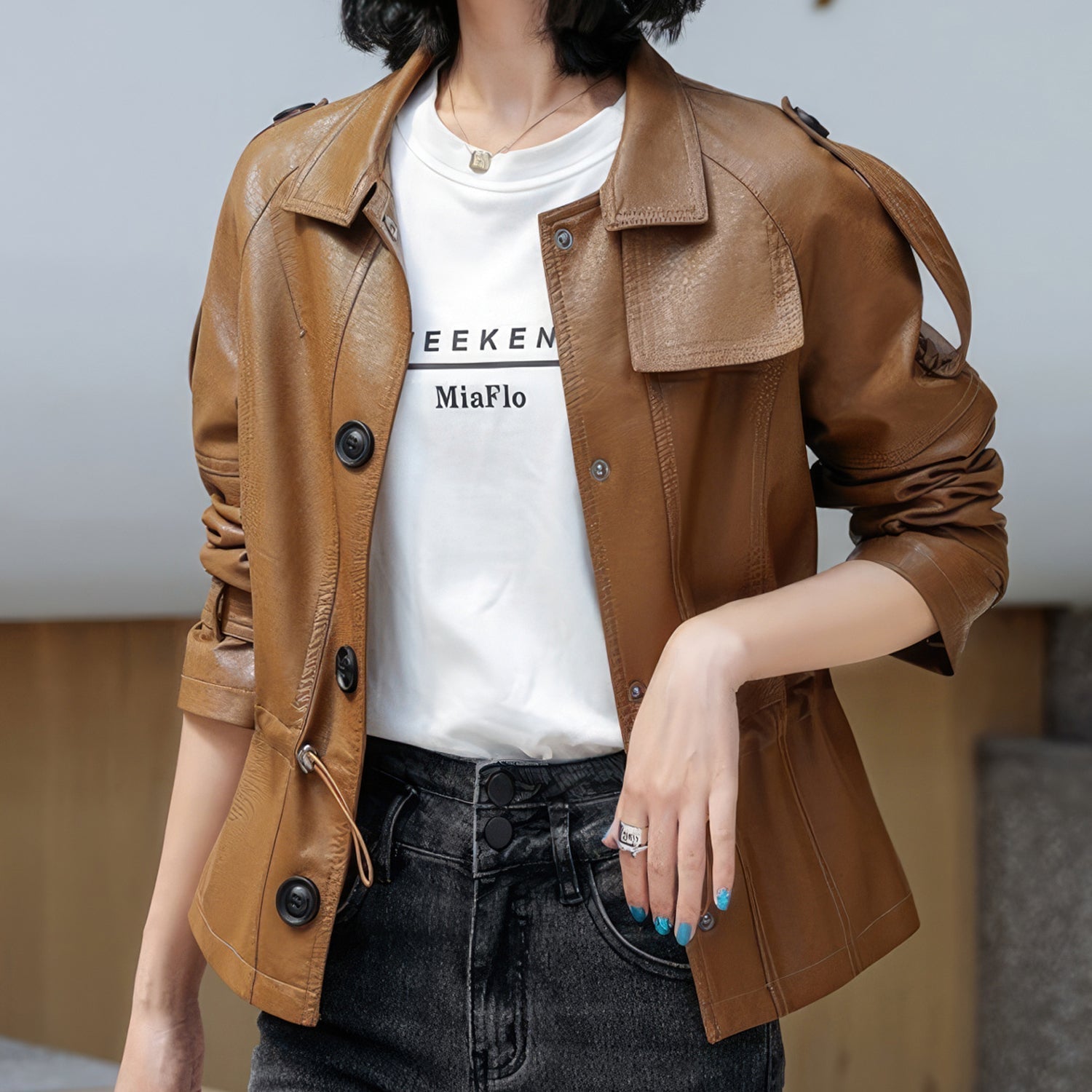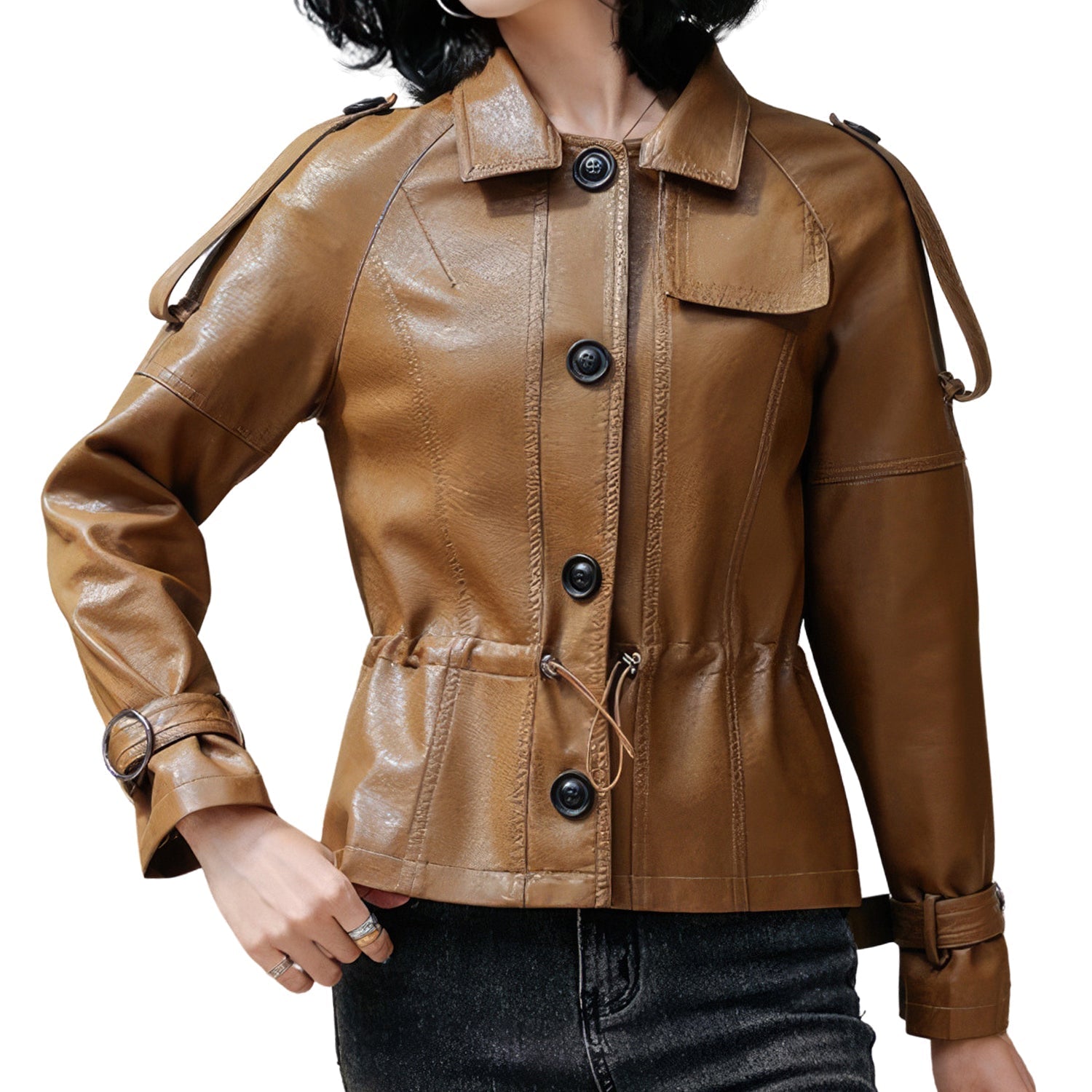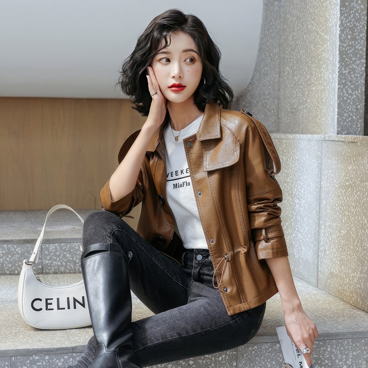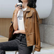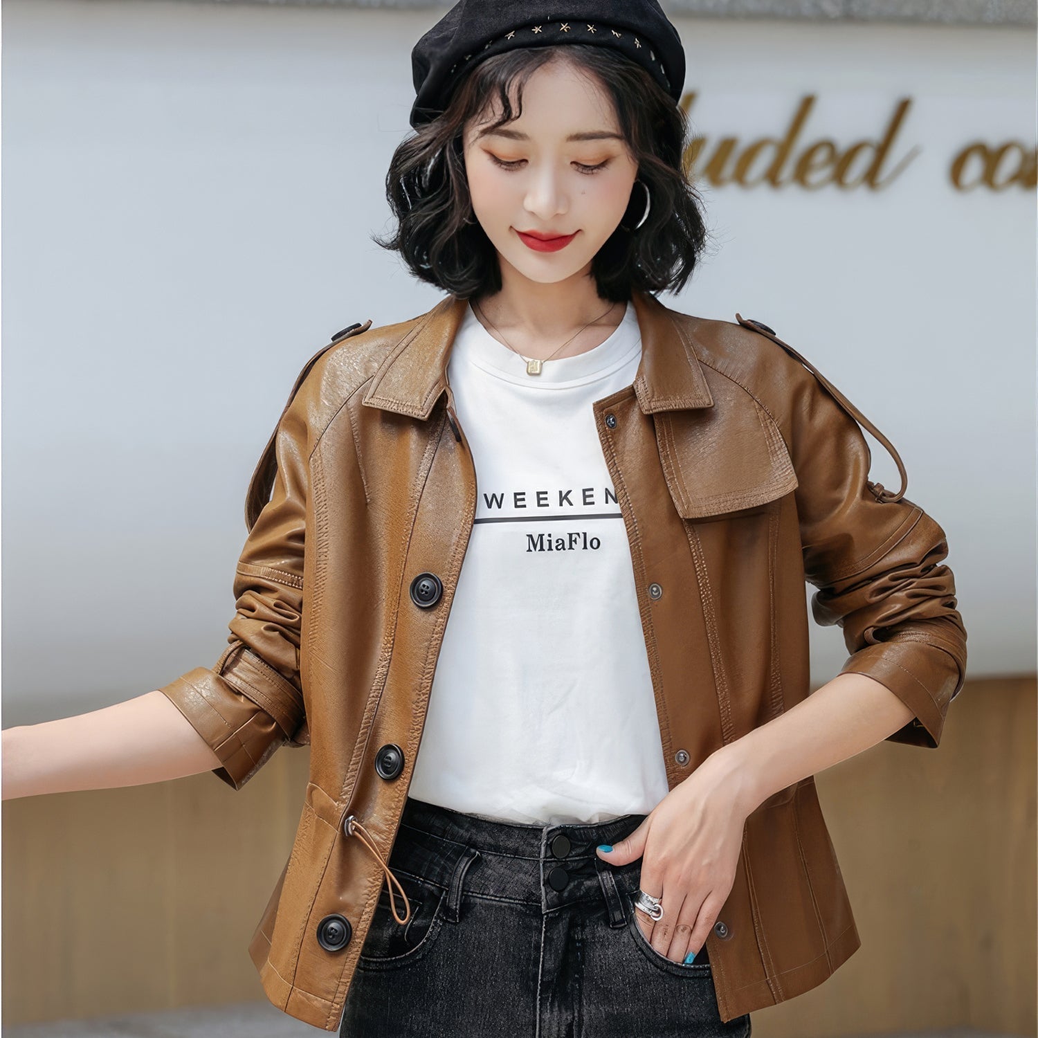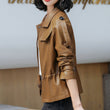 Women’s Brown Genuine Sheepskin Shirt Collar Classic Fashionable Slim Fit Drawstring Streetwear Casual Leather Jacket