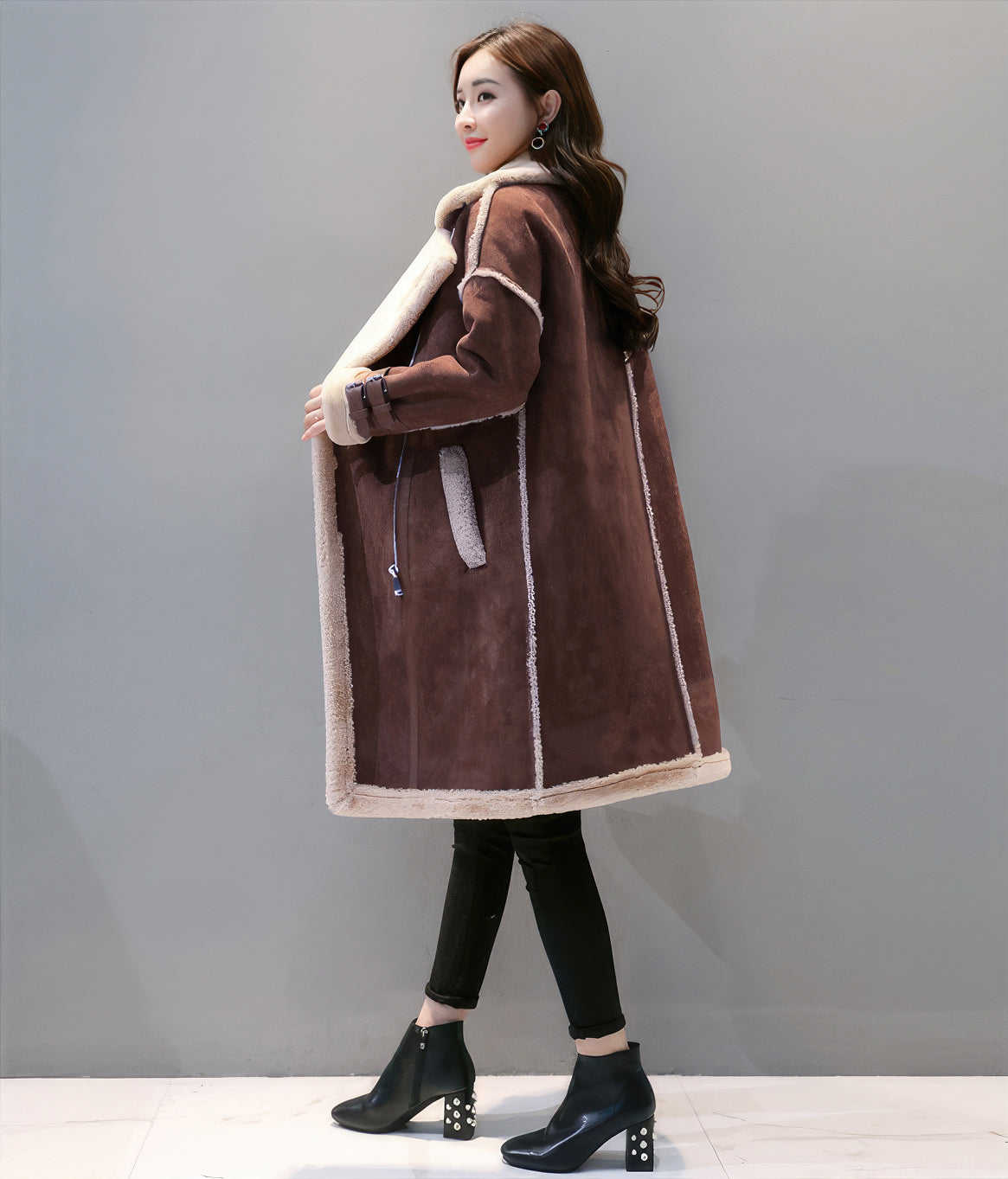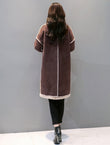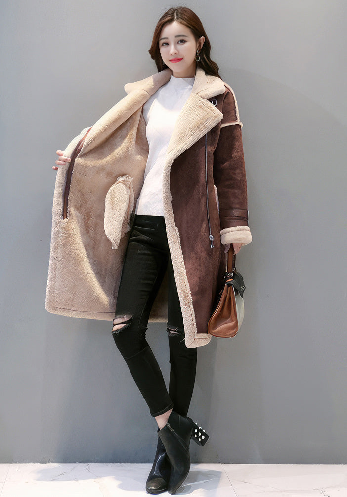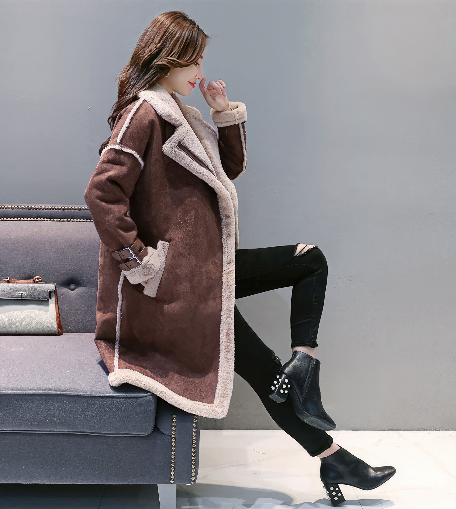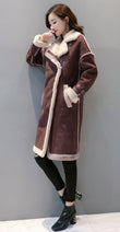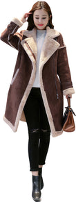 Women’s Brown Genuine Suede Sherpa Shearling Faux Fur Lined Winter Warm Thick Double Breasted Long Leather Coat