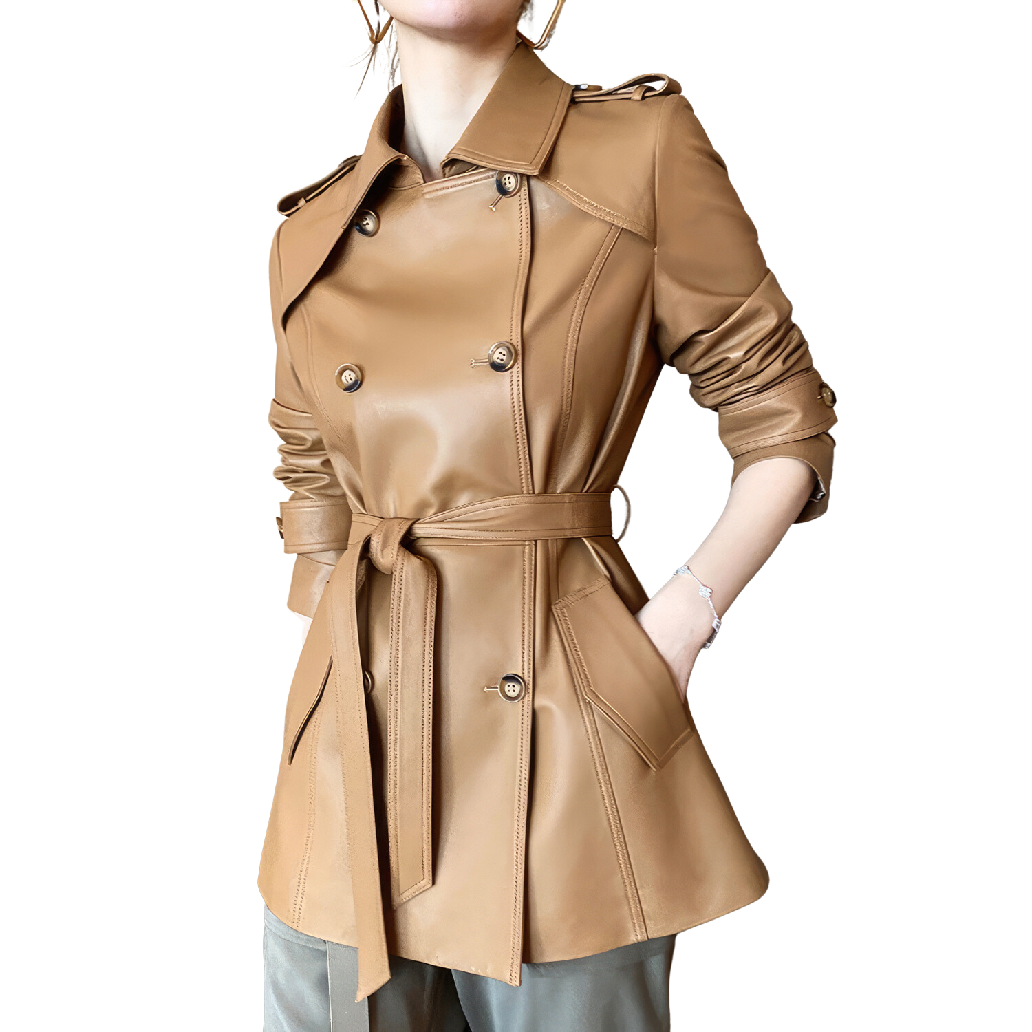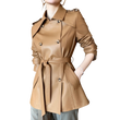 Women’s Coffee Brown Genuine Sheepskin Lapel Collar Business Fashion Double Breasted Belted Leather Trench Coat