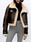 Women’s Distressed Brown Genuine Lambskin Sherpa Shearling Faux Fur Lined Moto Biker Fashion Winter Thick Bomber Leather Jacket
