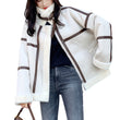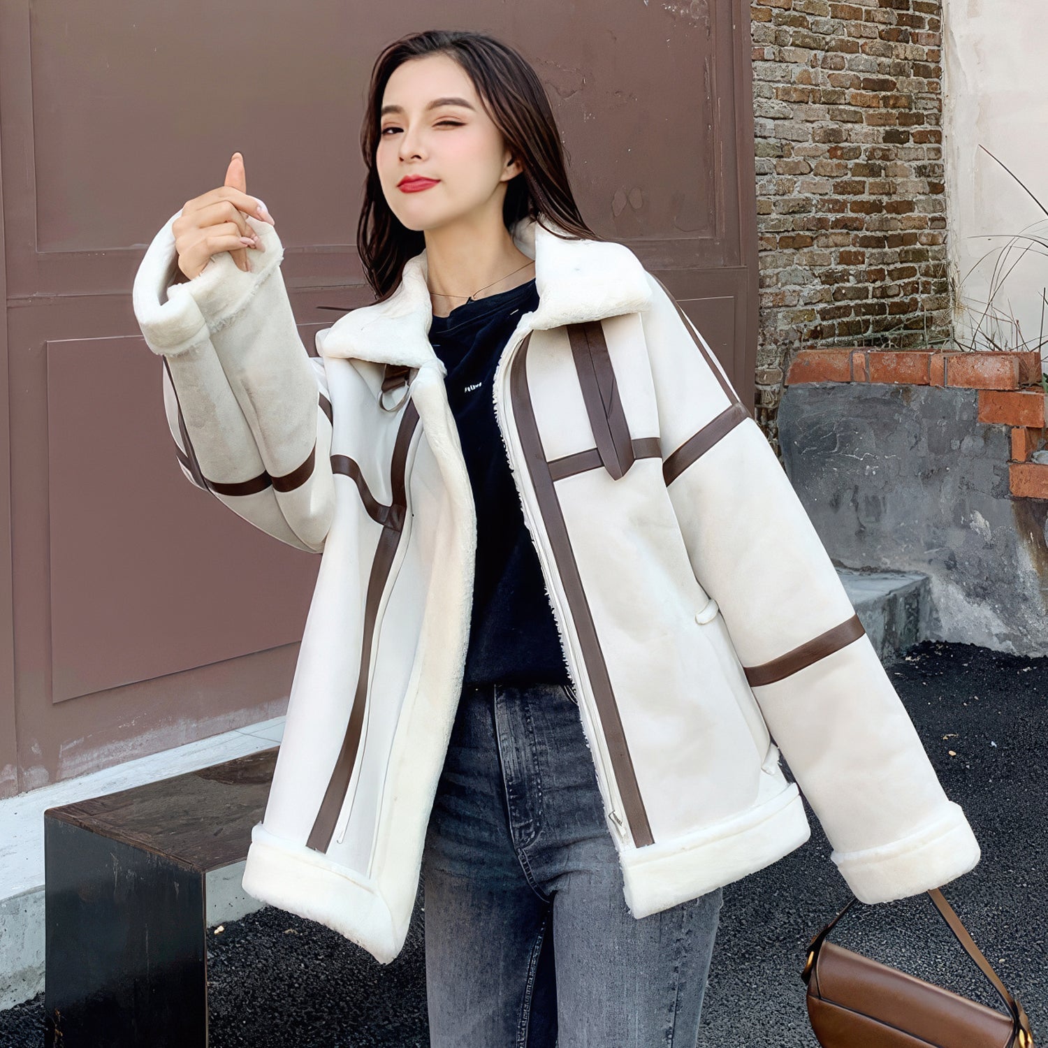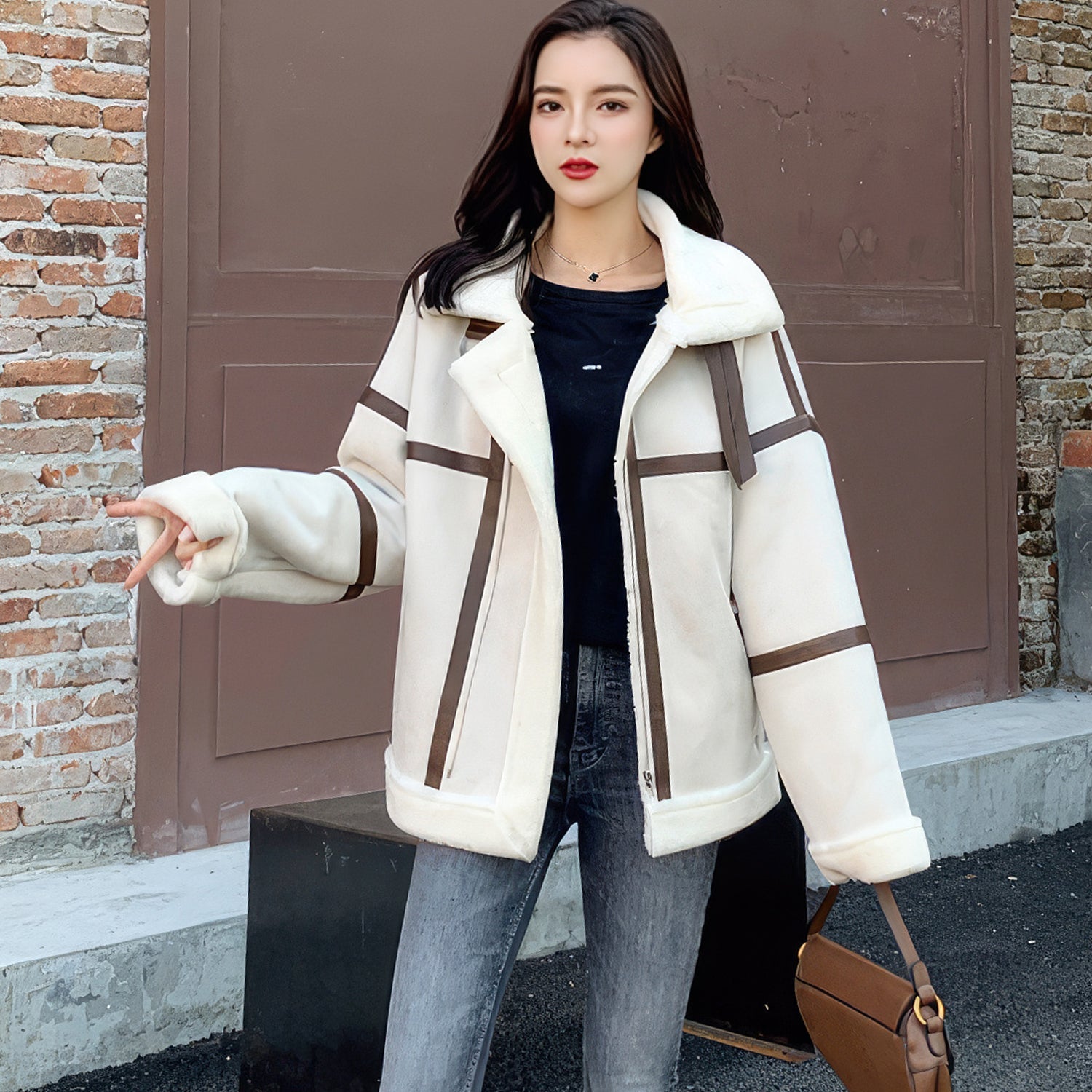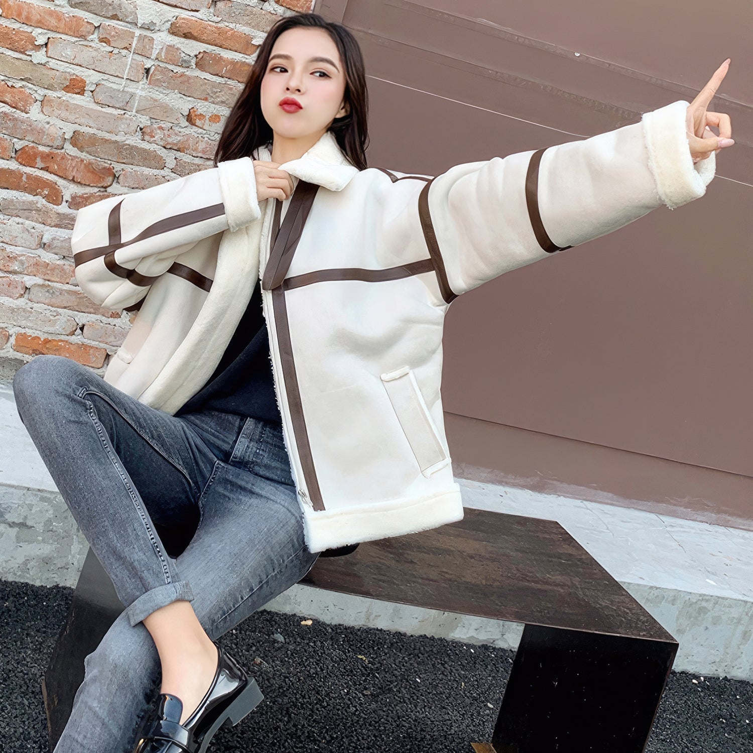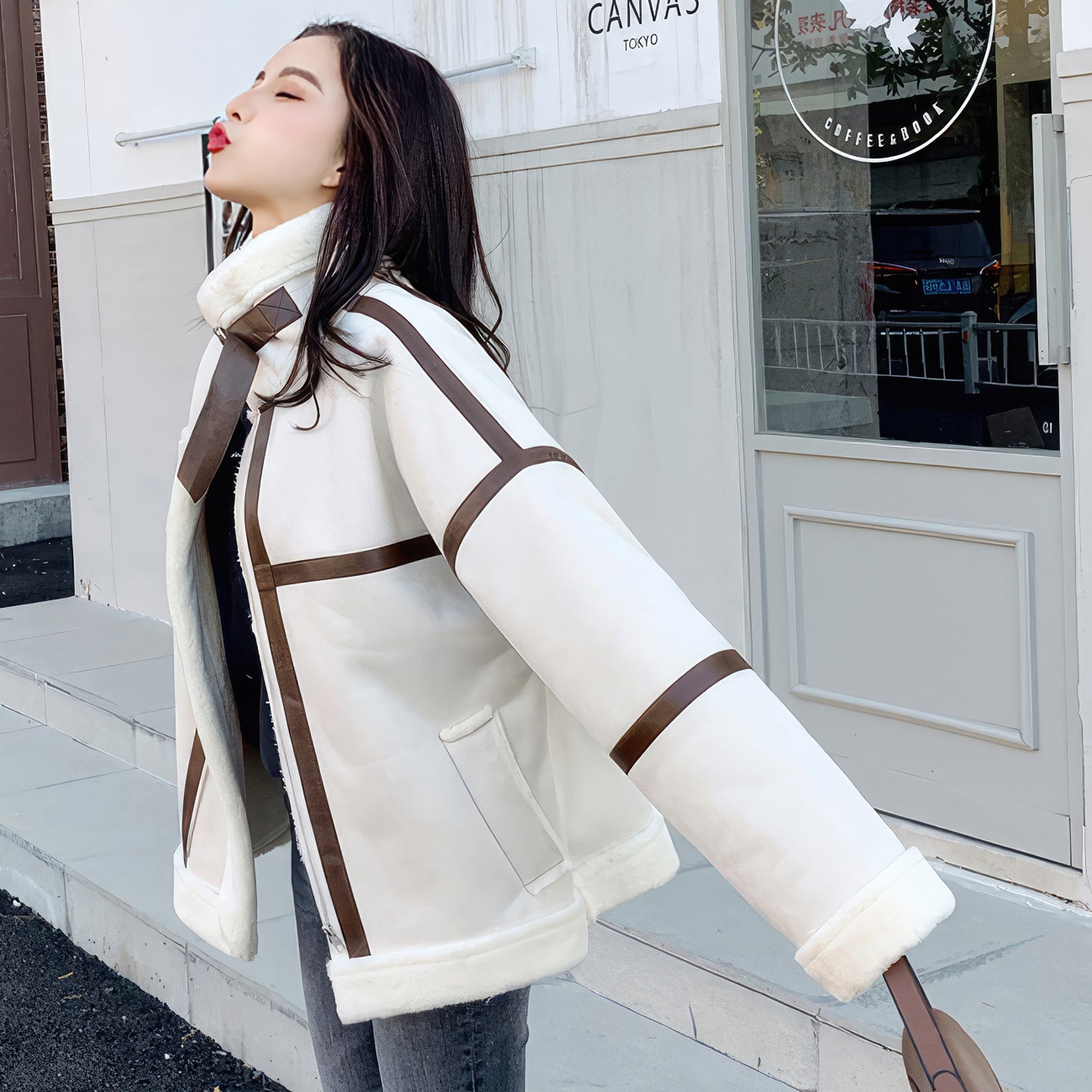 Women’s Off-White Genuine Suede Sherpa Shearling Faux Fur Lined Brown Strips Loose Oversized Motorcycle Racer Leather Jacket