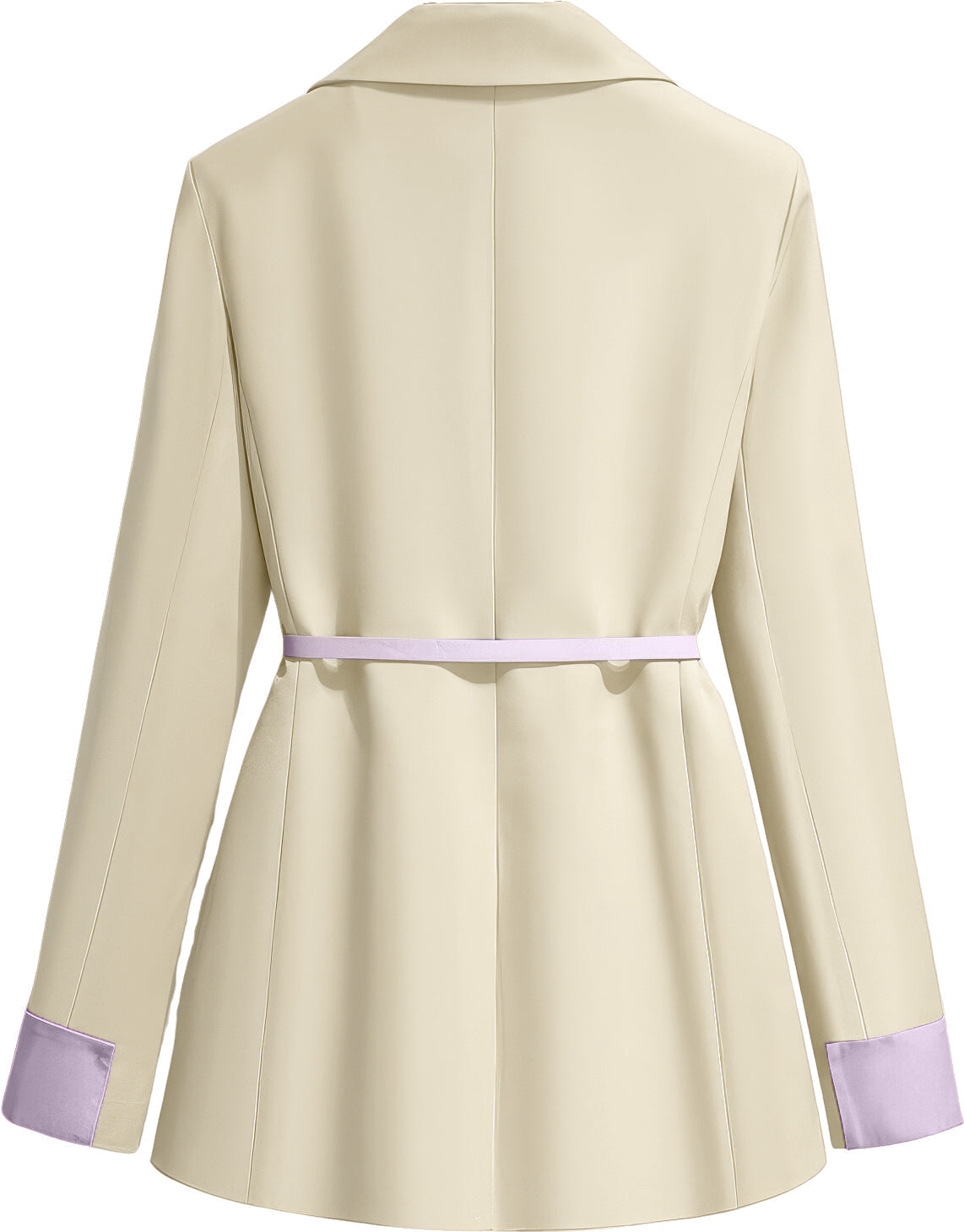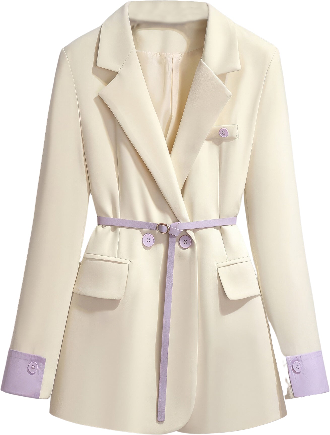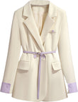 Women’s Off-White PU Faux Double Breasted Korean Style Classic Fashionable Purple Belted Casual Streetwear Office Leather Blazer