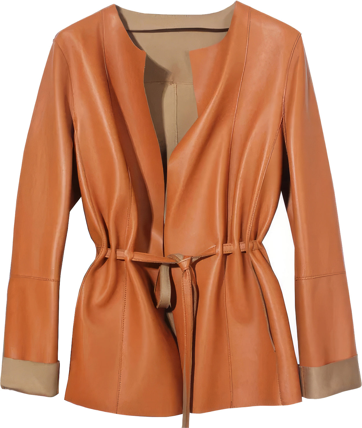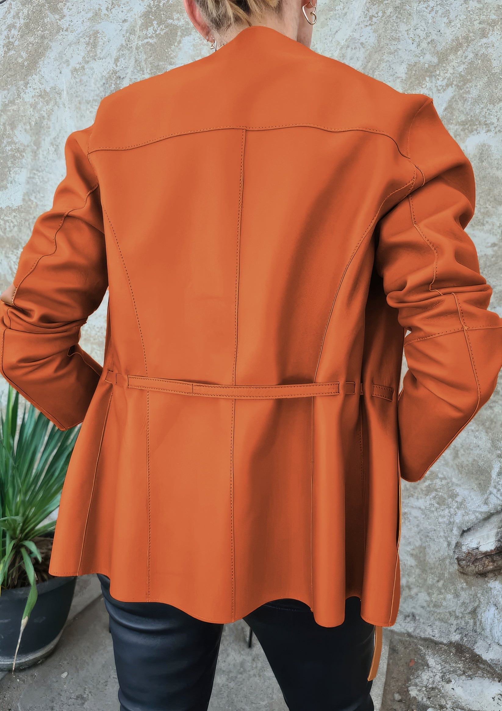 Women’s Orange Genuine Sheepskin Round Neck Casual European Streetwear Top Fashion Pleated Simple Classic Leather Coat