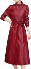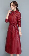 Women’s Red Genuine Sheepskin Stand Collar Slim Fit Belted High Street Smooth Lightweight Elegant Fashion Leather Coat
