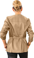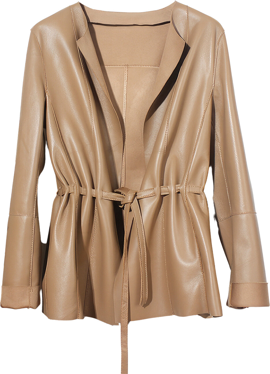 Women’s Sepia Brown Genuine Sheepskin Round Neck Casual European Streetwear Top Fashion Pleated Simple Classic Leather Coat
